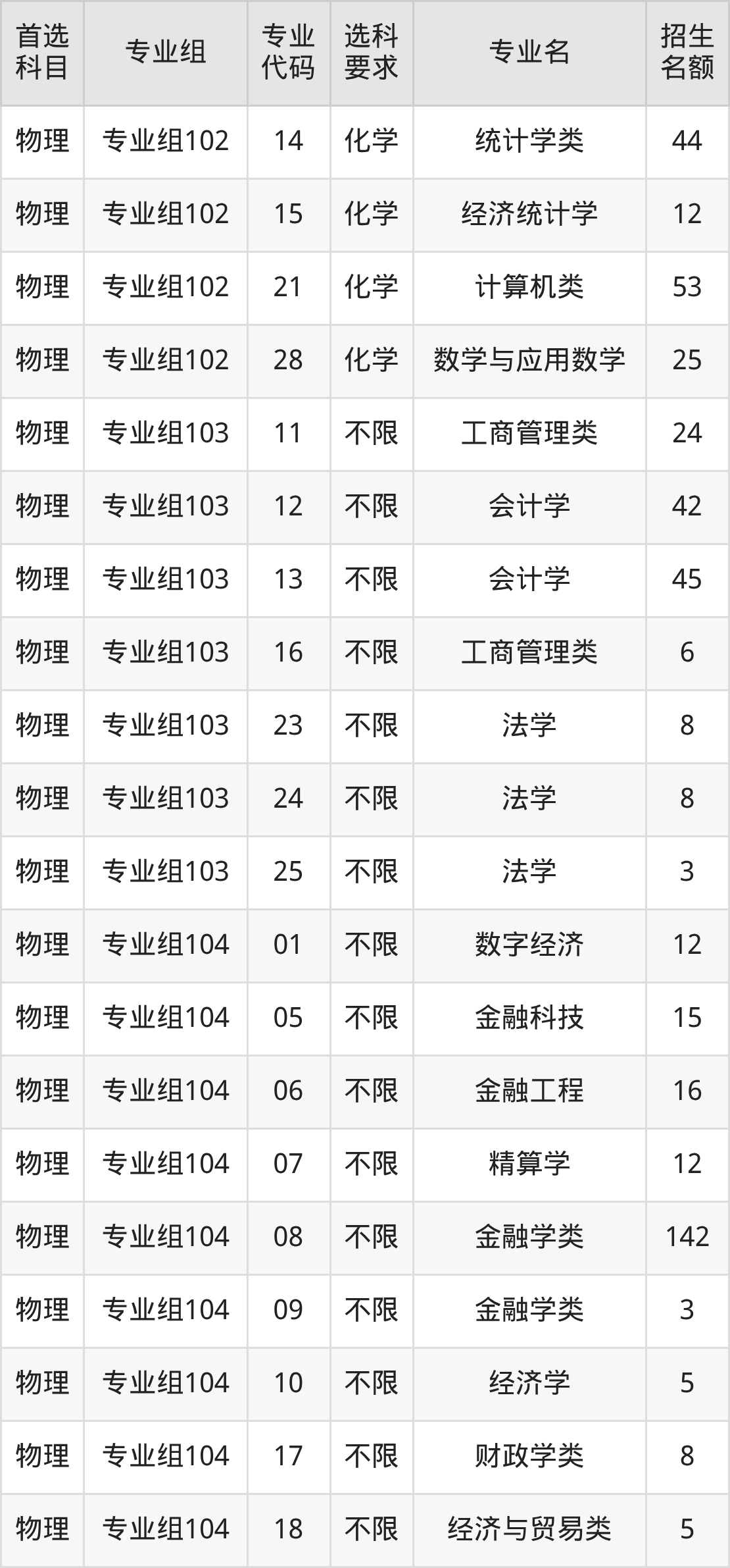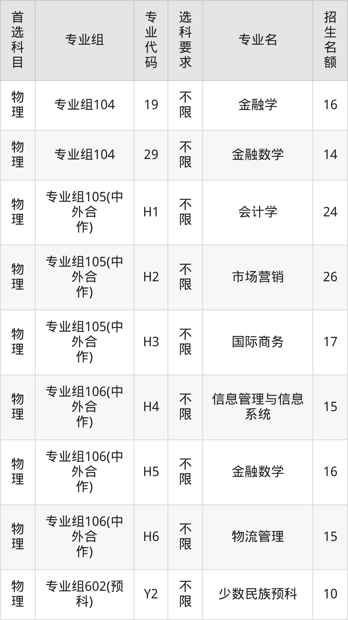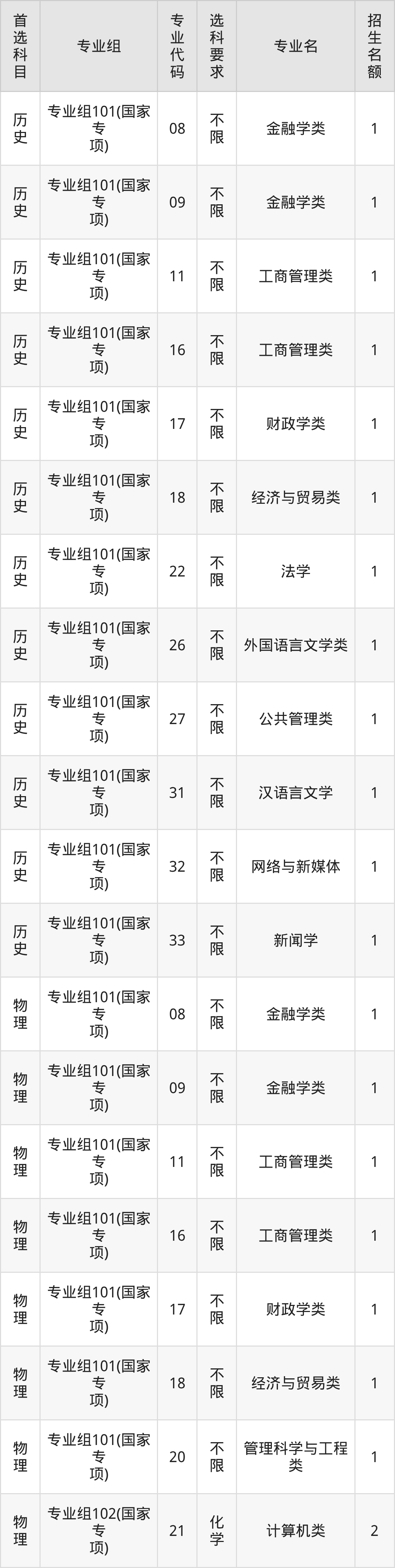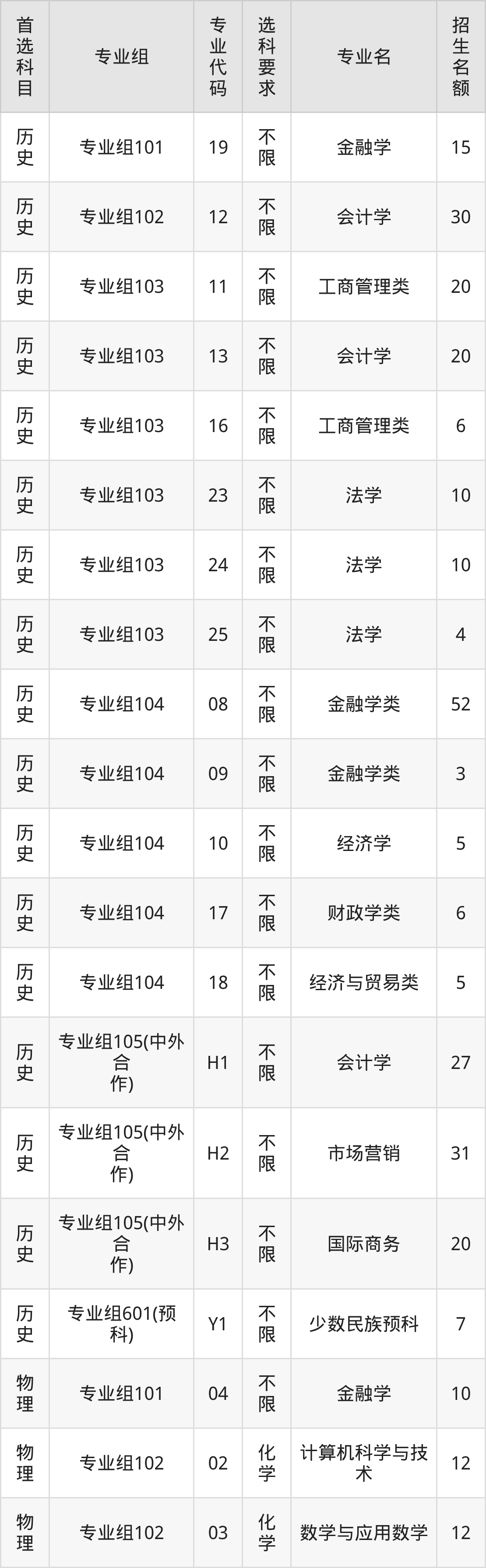 各专业选科要求、招生名额汇总如下: