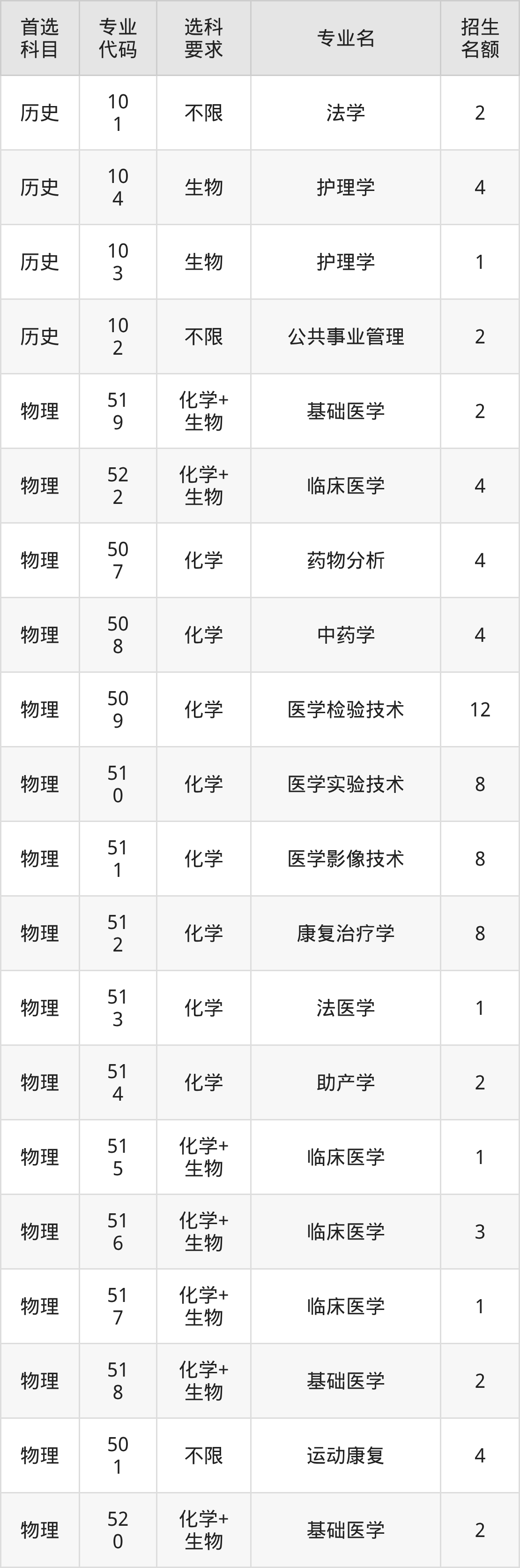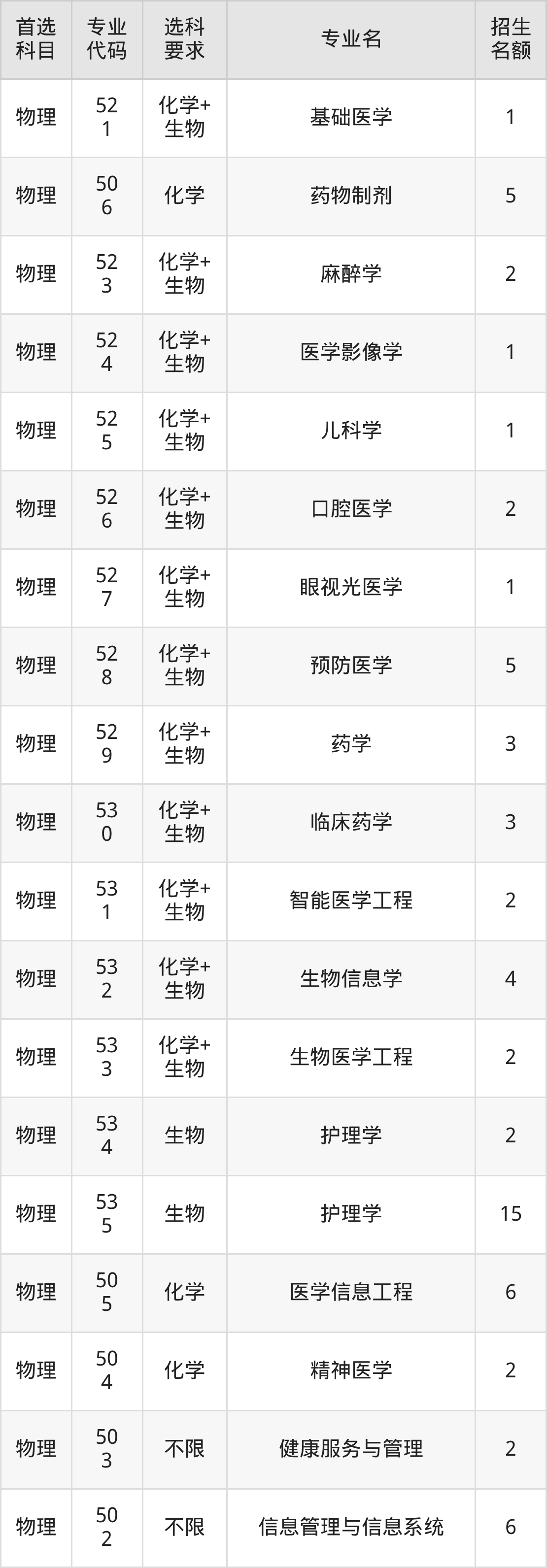 各专业选科要求、招生名额汇总如下: