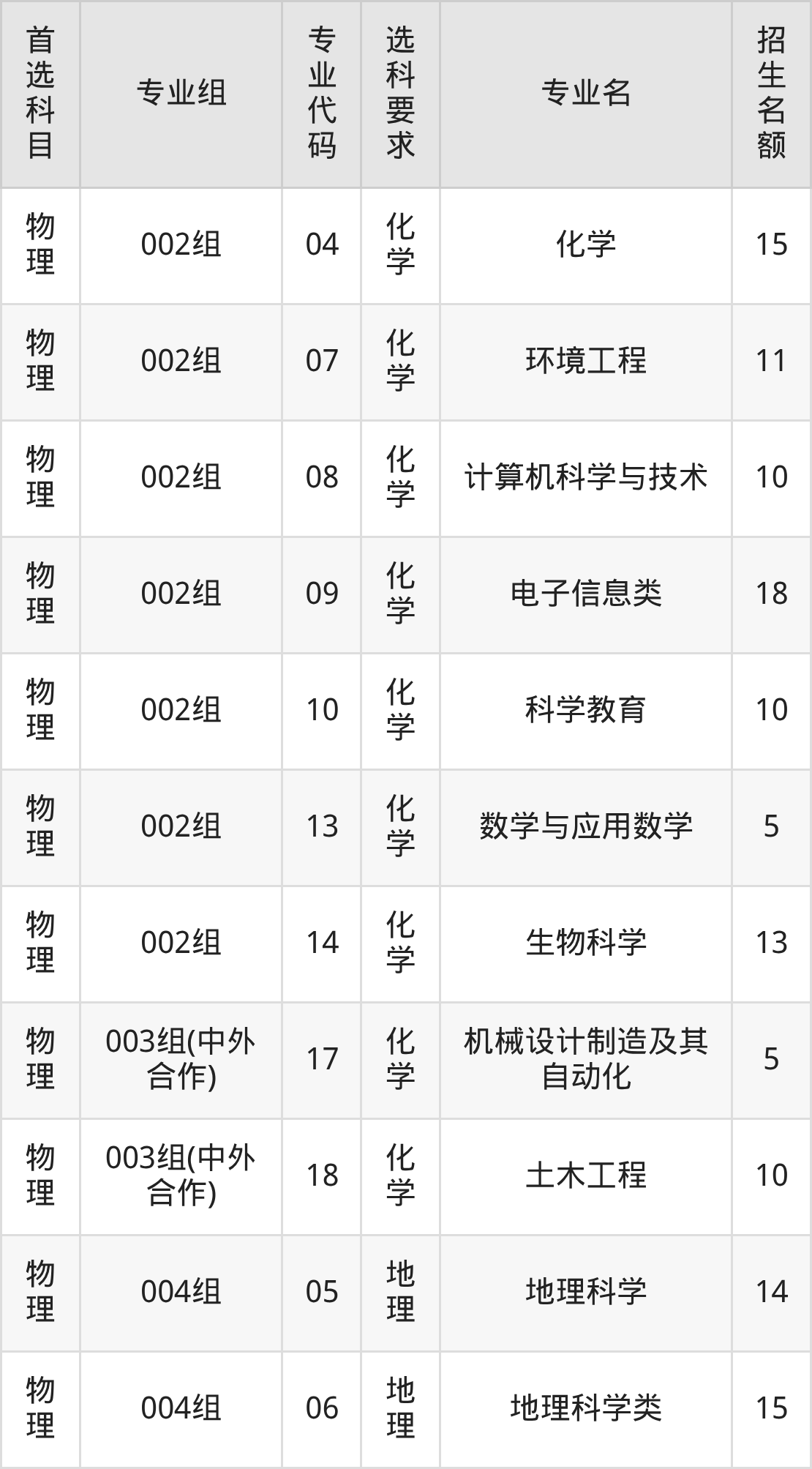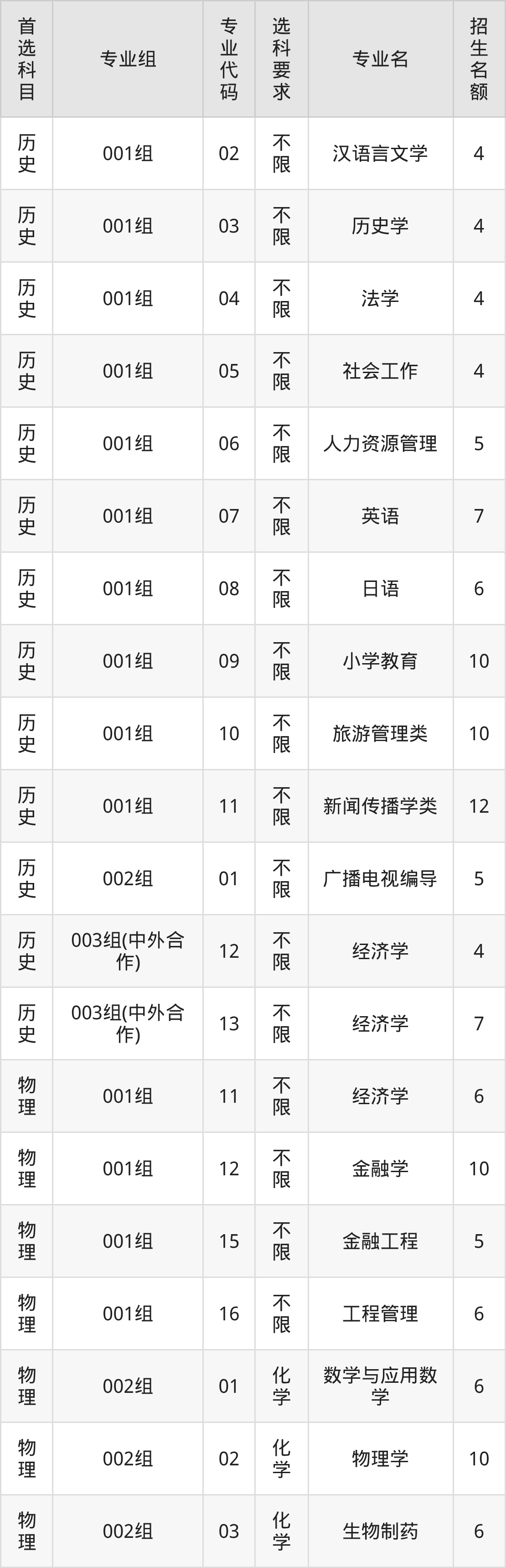 各专业选科要求、招生名额汇总如下: