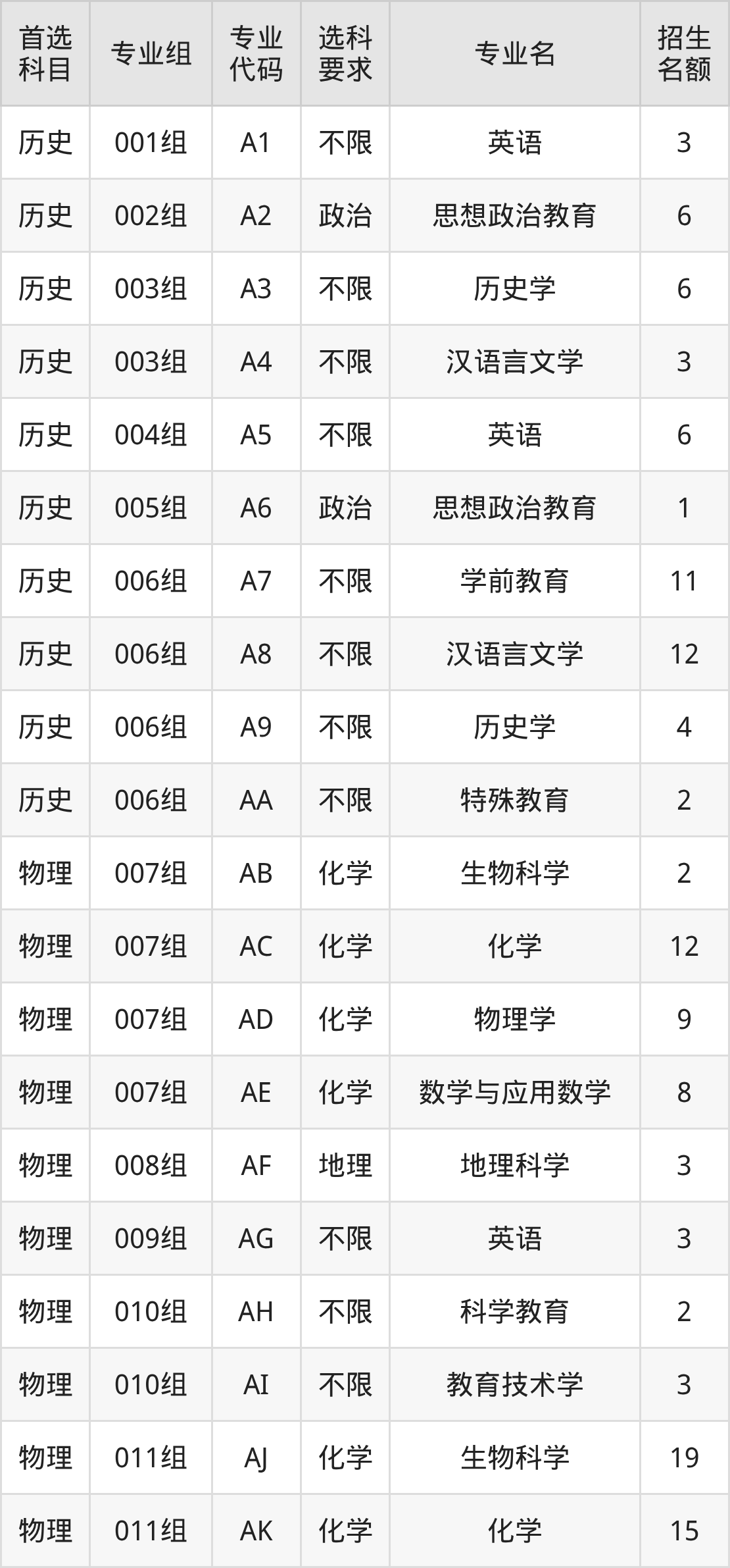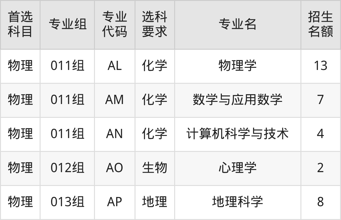 各专业选科要求、招生名额汇总如下: