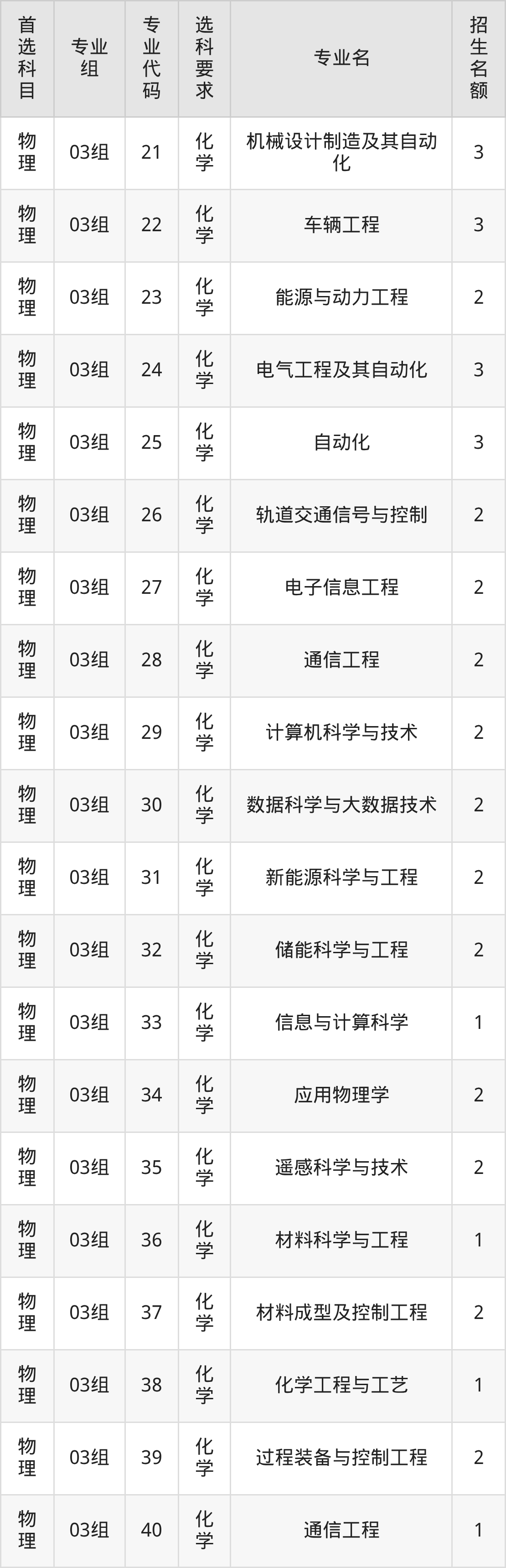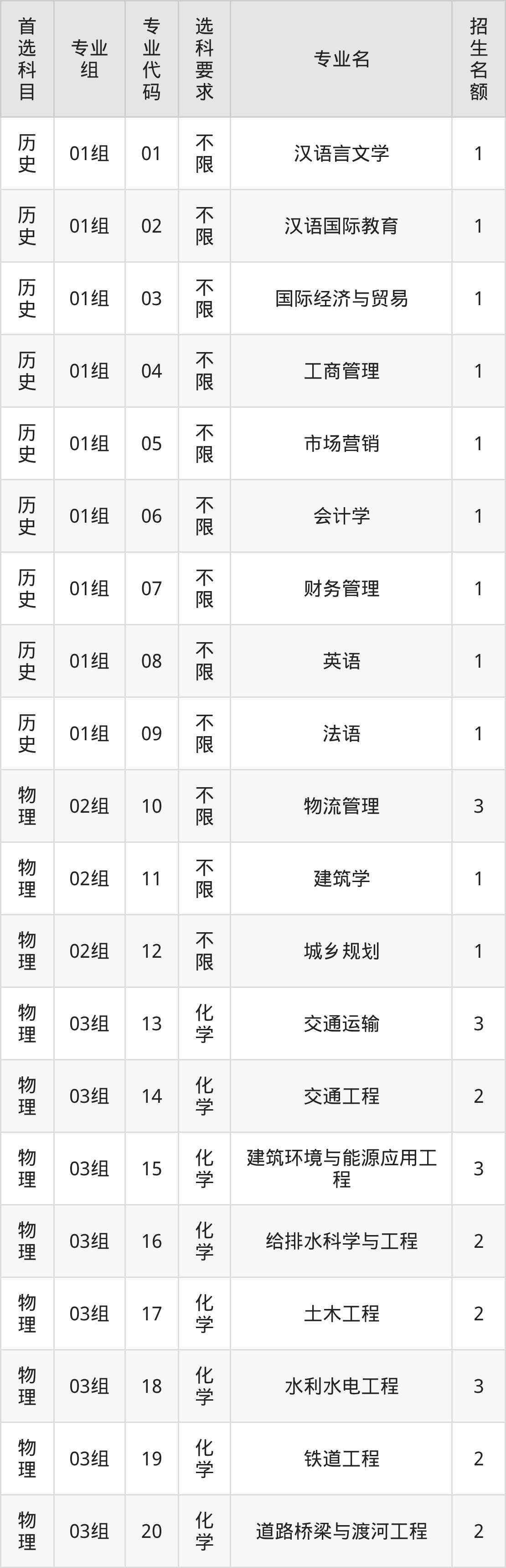 各专业选科要求、招生名额汇总如下:
