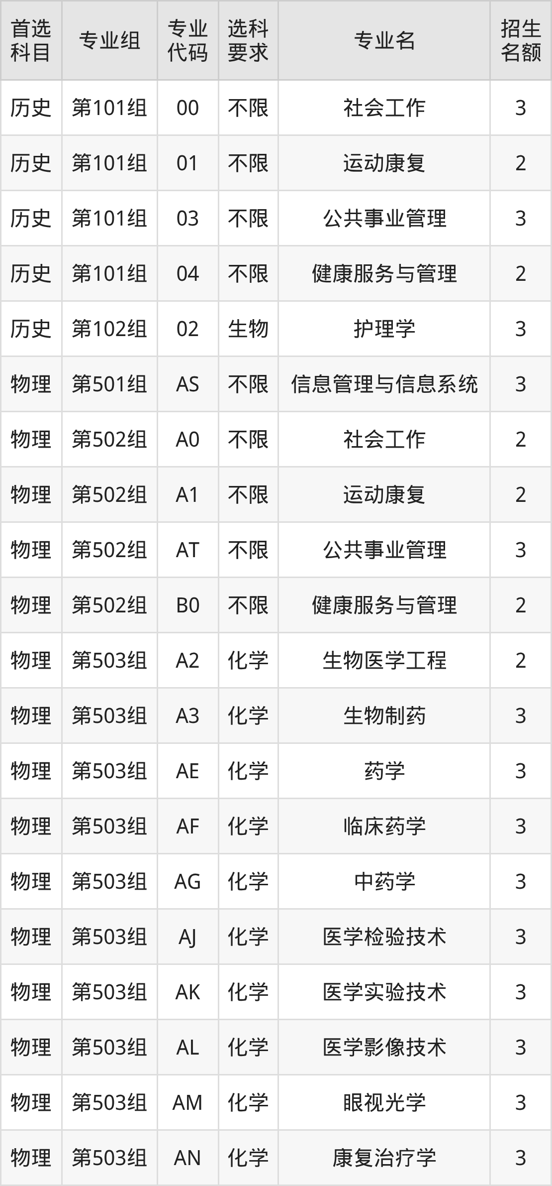 各专业选科要求、招生名额汇总如下: