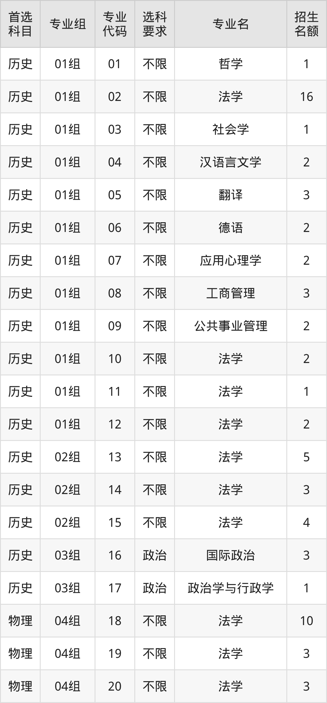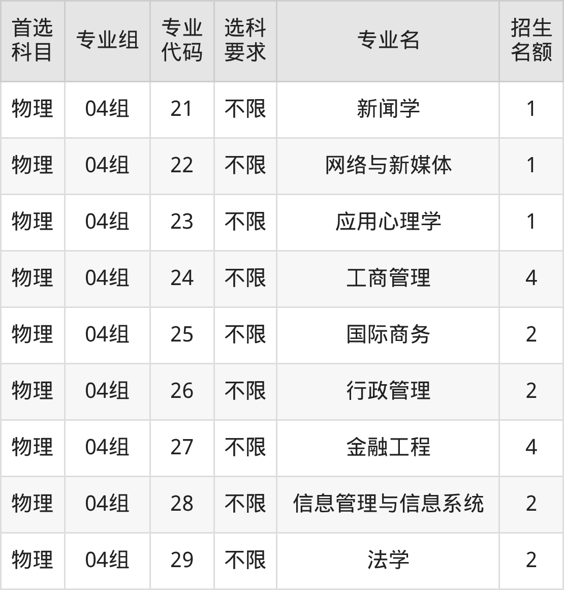 各专业选科要求、招生名额汇总如下: