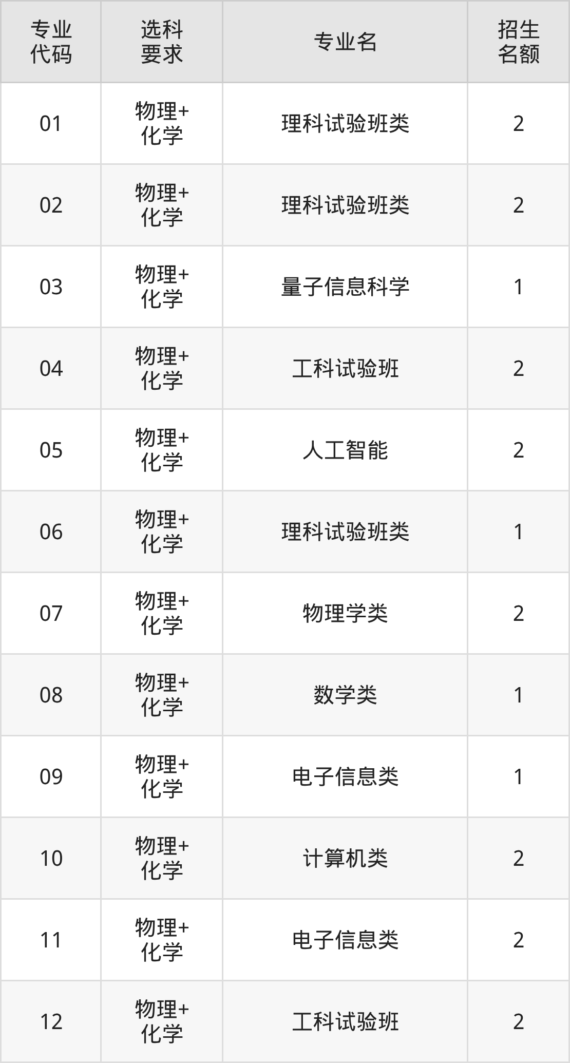 2025年中国科学技术大学在天津市本科批A段招生中,总计划人数为20人,招生专业有8个,包括理科试验班类(5人)、量子信息科学(1人)、工科试验班(4人)、人工智能(2人)等。