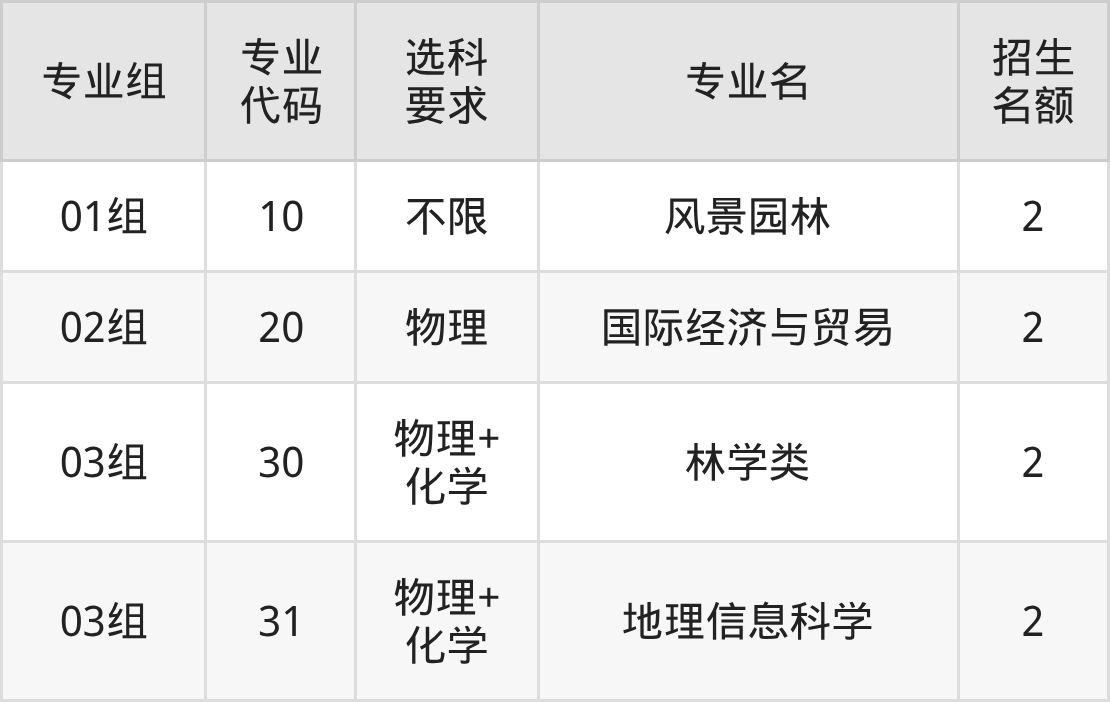 2025年南京林业大学在北京市本科批招生中,总计划人数为8人,招生专业有4个,包括风景园林(2人)、国际经济与贸易(2人)、林学类(2人)、地理信息科学(2人)等。