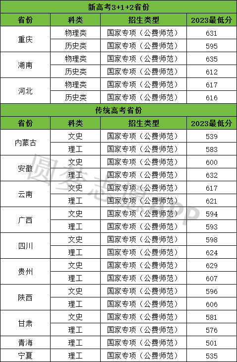 2023年华东师范大学公费师范生除了在上文的提前批有招生外,另外在各省国家专项计划中也有公费师范生的招生计划,下面老师就为大家整理2023年华东师范大学在各省国家专项中公费师范生的录取分数线。