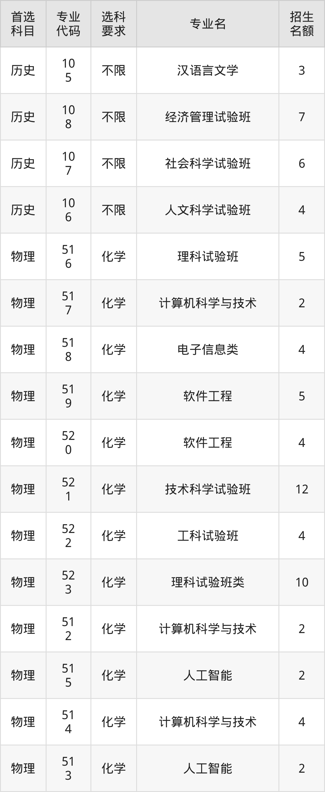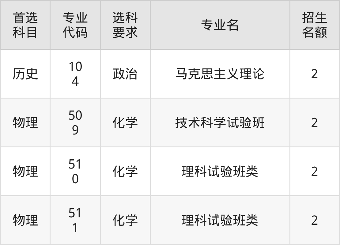 各专业选科要求、招生名额汇总如下: