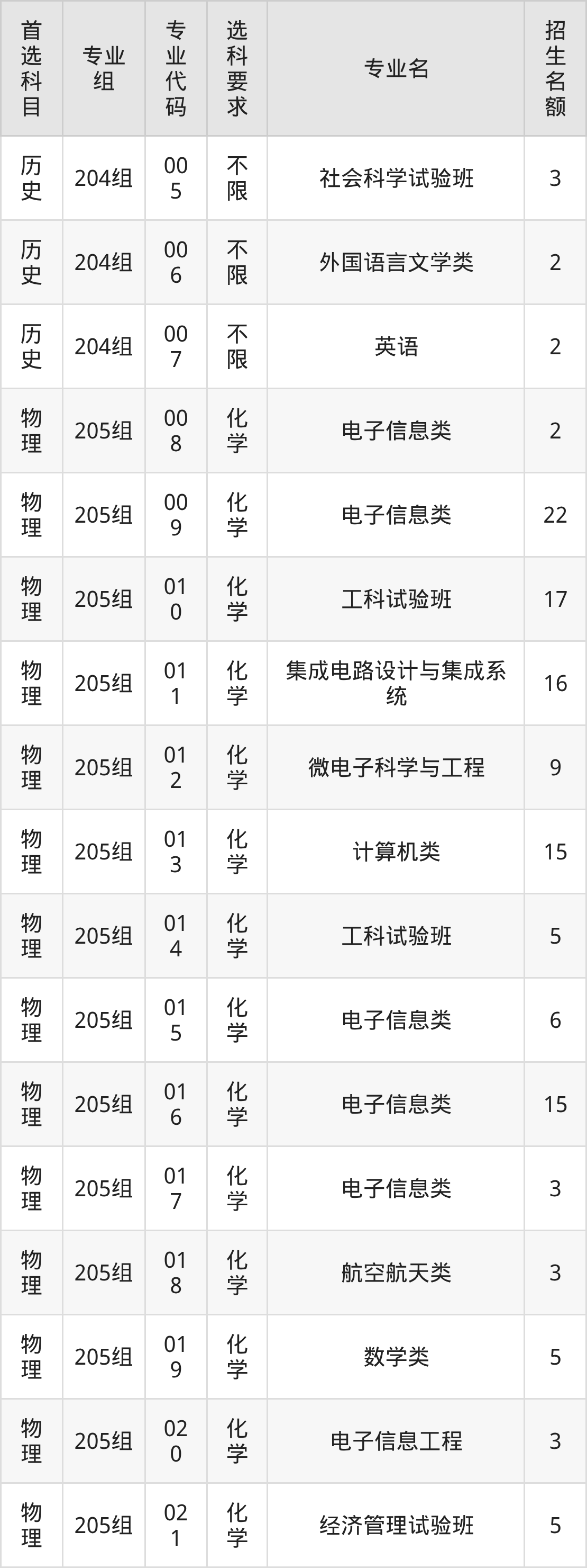 各专业选科要求、招生名额汇总如下: