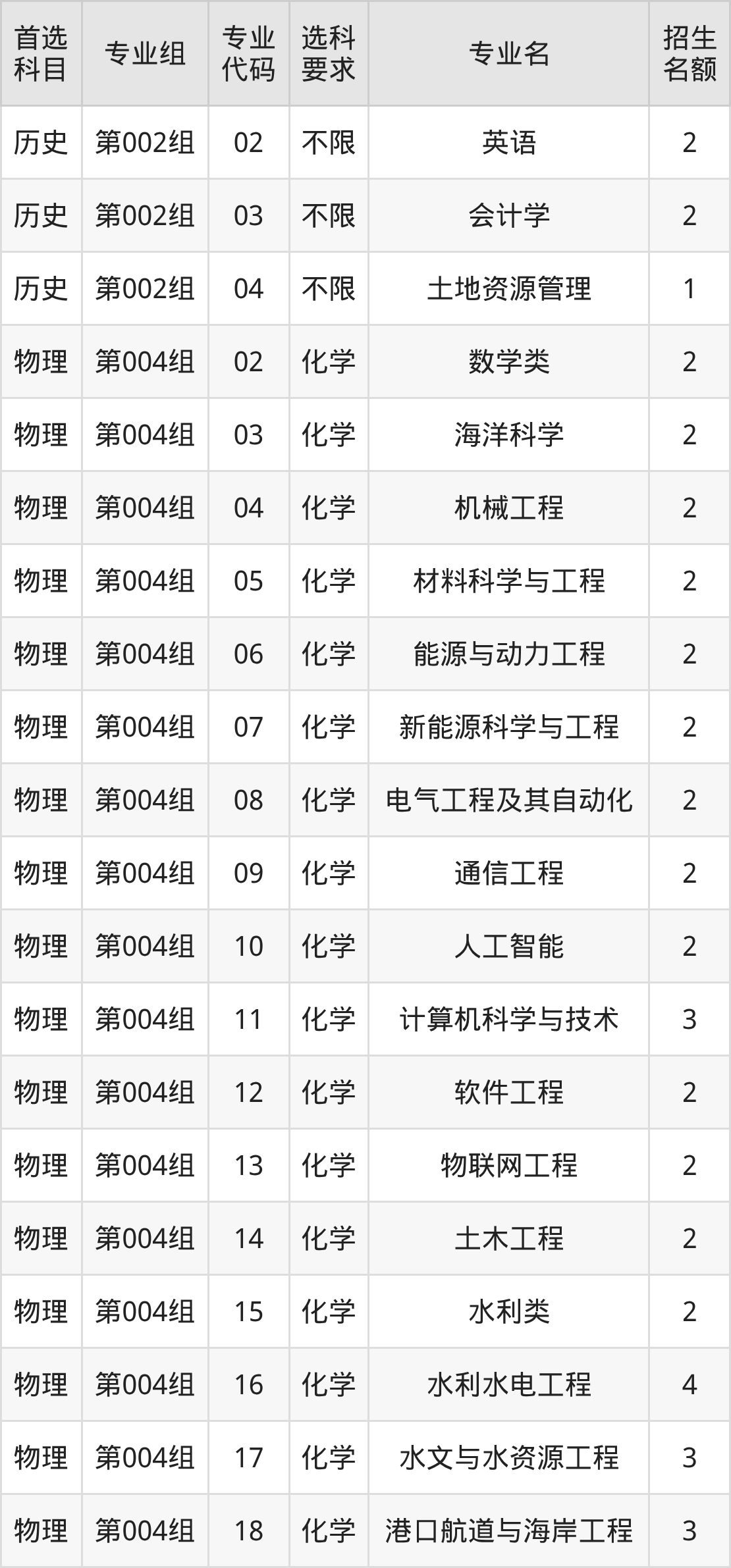 各专业选科要求、招生名额汇总如下: