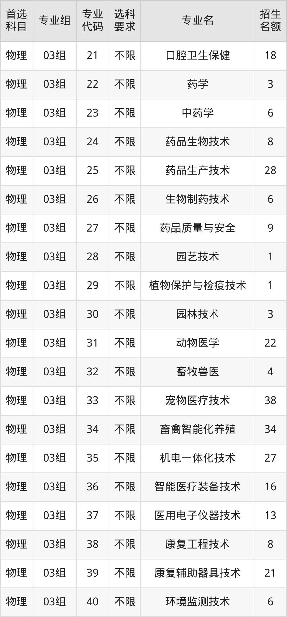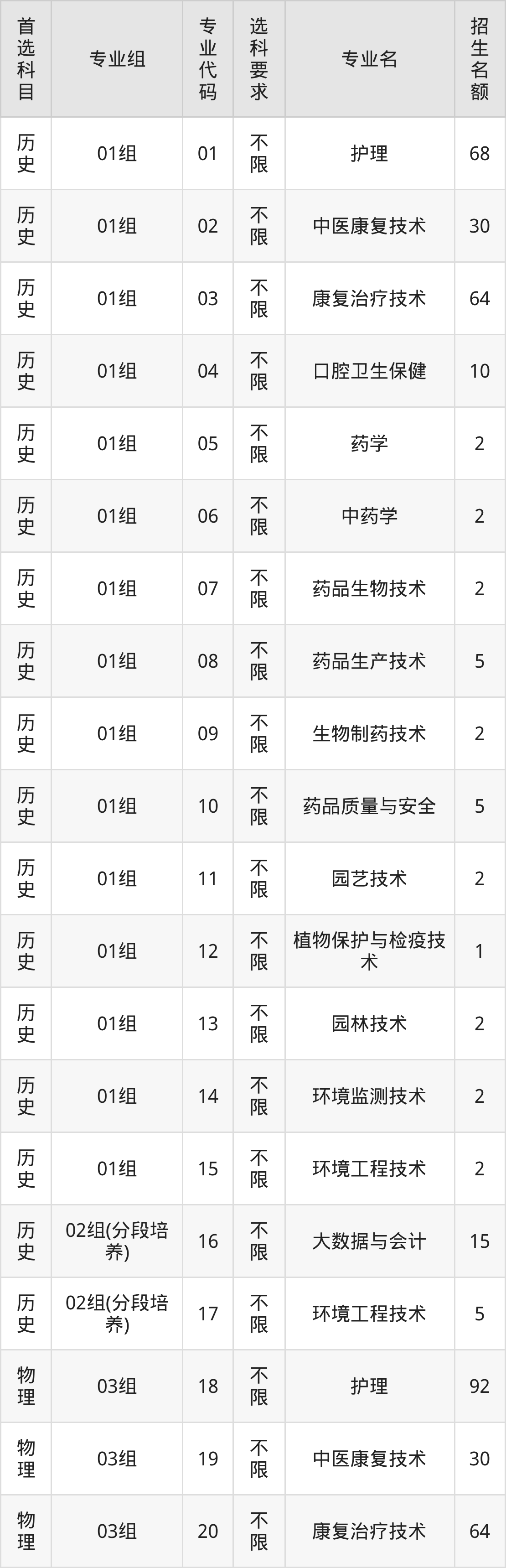 各专业选科要求、招生名额汇总如下: