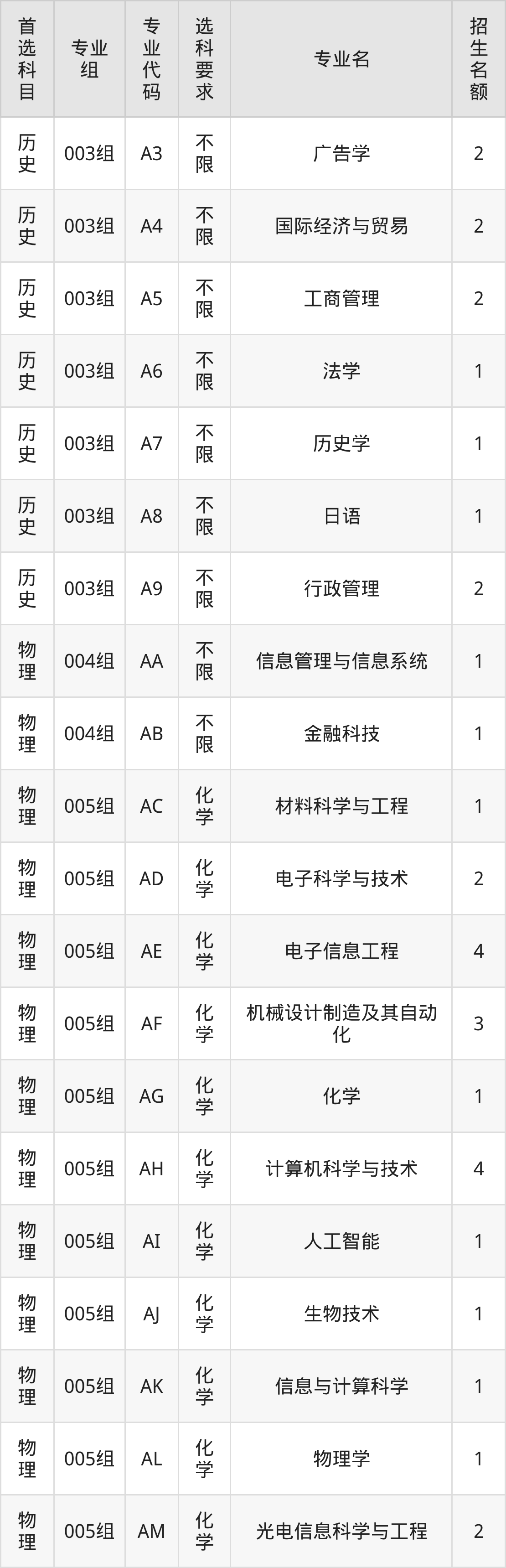 各专业选科要求、招生名额汇总如下: