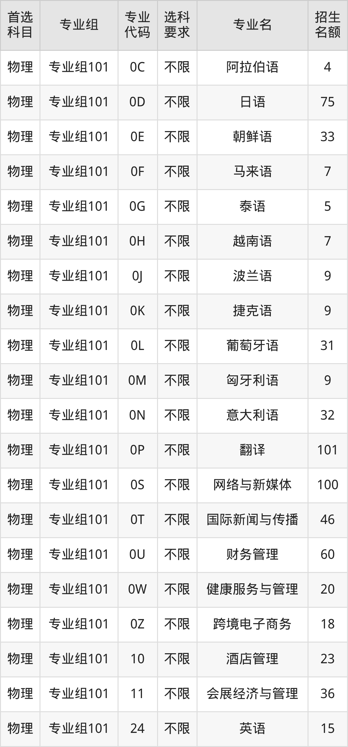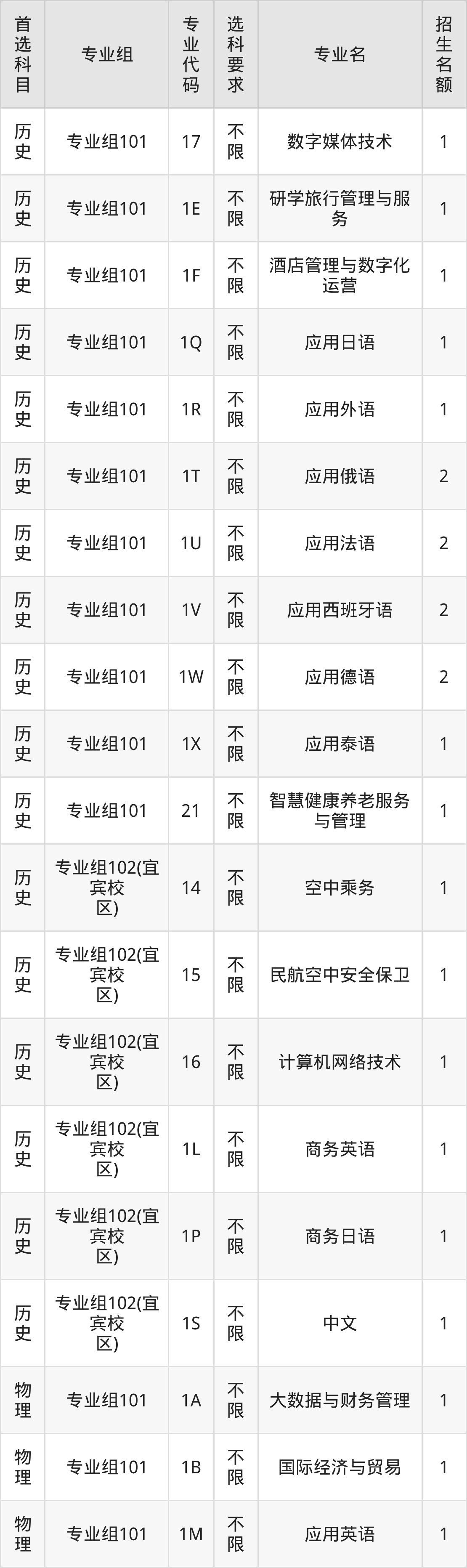 各专业选科要求、招生名额汇总如下: