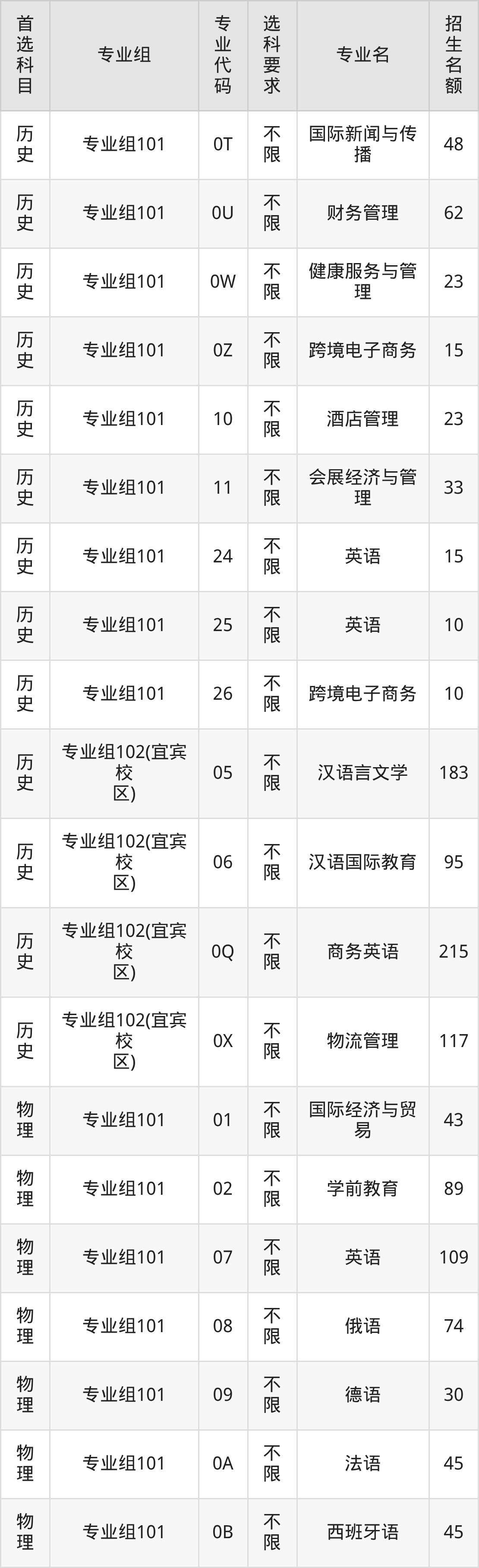 | 历史 | 专业组102(宜宾校 区) | 421 | 101838 |