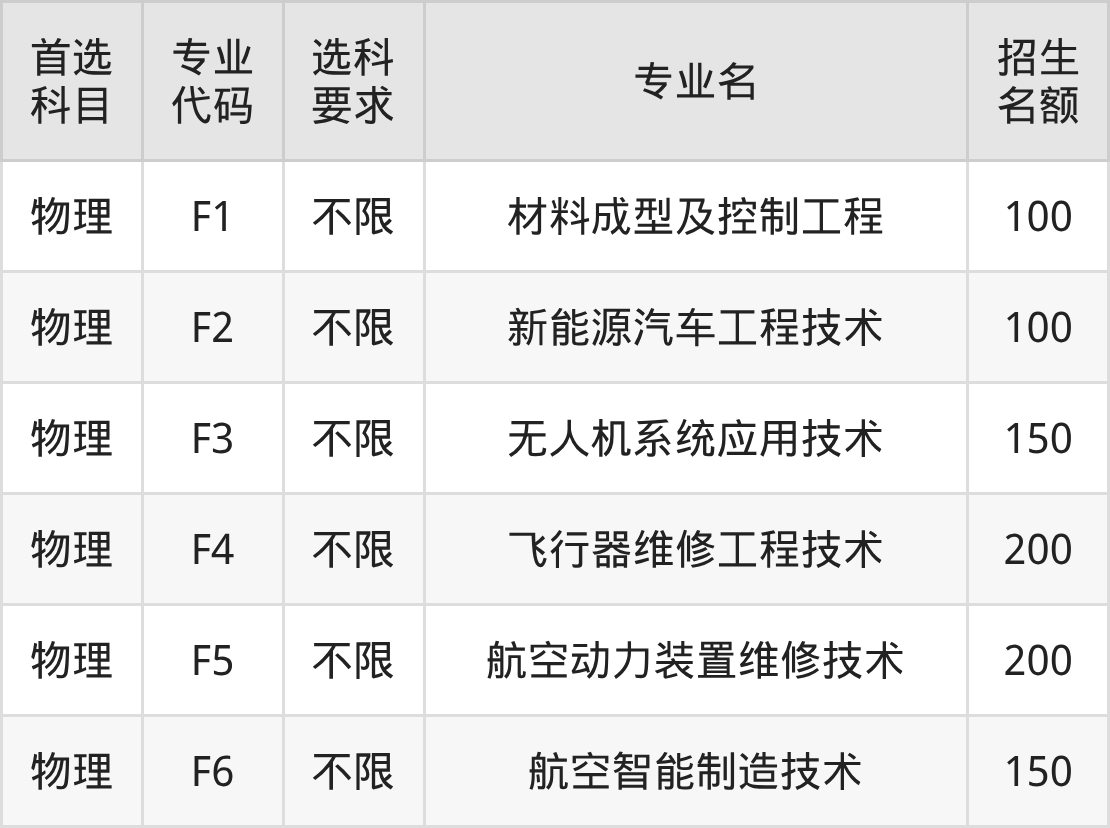 2025年成都航空职业技术大学在四川省本科批B段招生中,总计划人数为900人,招生专业有6个,包括材料成型及控制工程(100人)、新能源汽车工程技术(100人)、无人机系统应用技术(150人)、飞行器维修工程技术(200人)等。