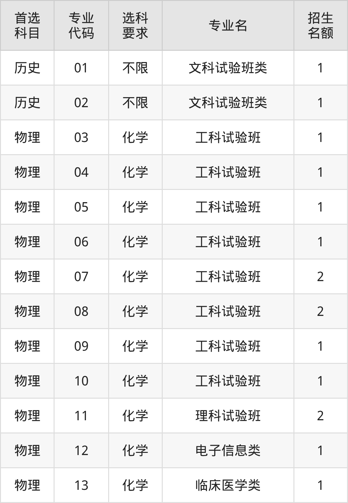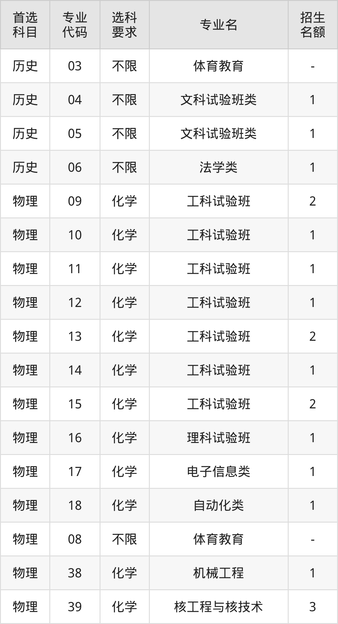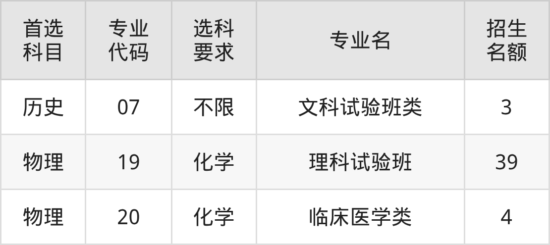 各专业选科要求、招生名额汇总如下: