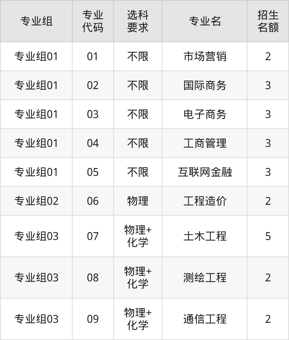 各专业选科要求、招生名额汇总如下: