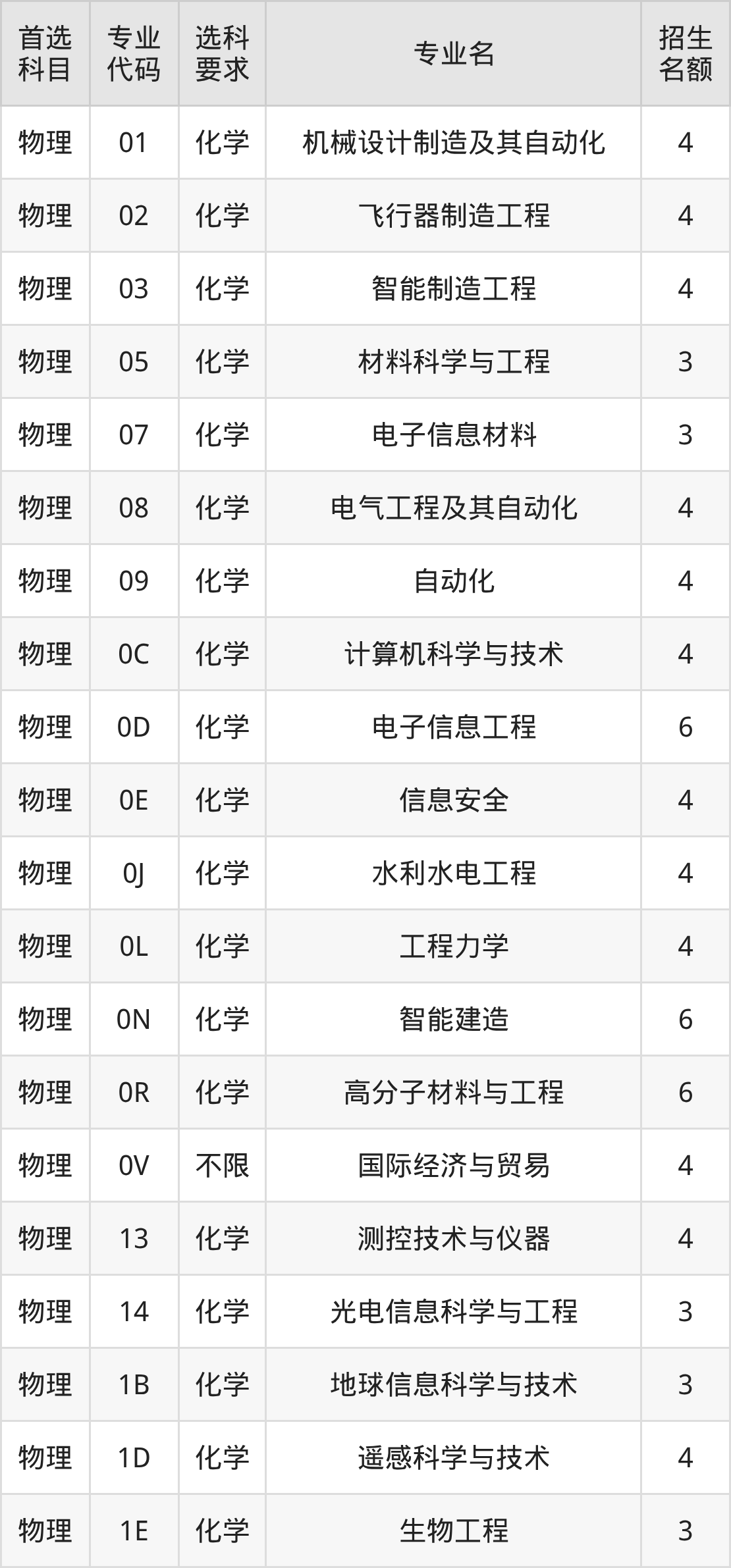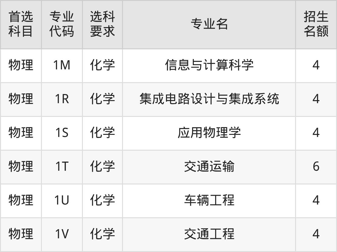 各专业选科要求、招生名额汇总如下: