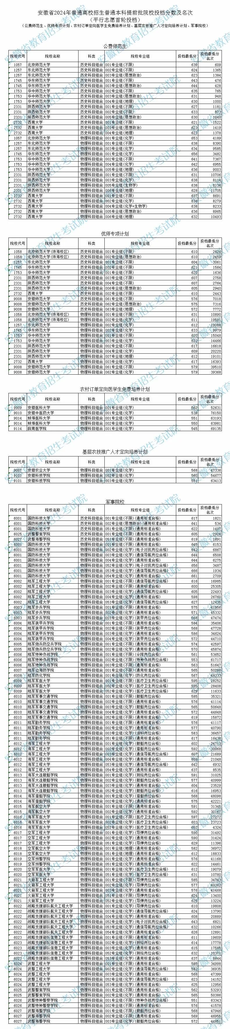 安徽2024年高考本科提前批投档线已经公布。在安徽首选物理科目高考本科提前批投档中,军校的投档分数线为: