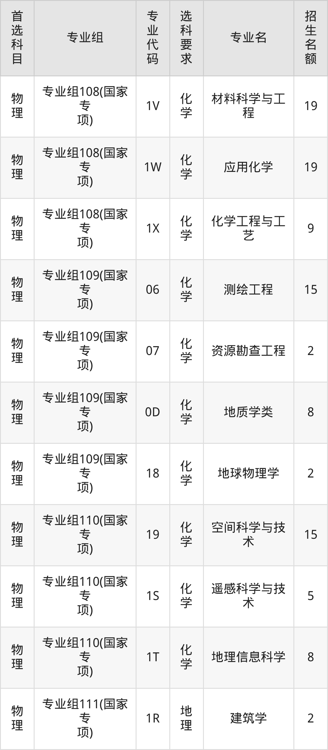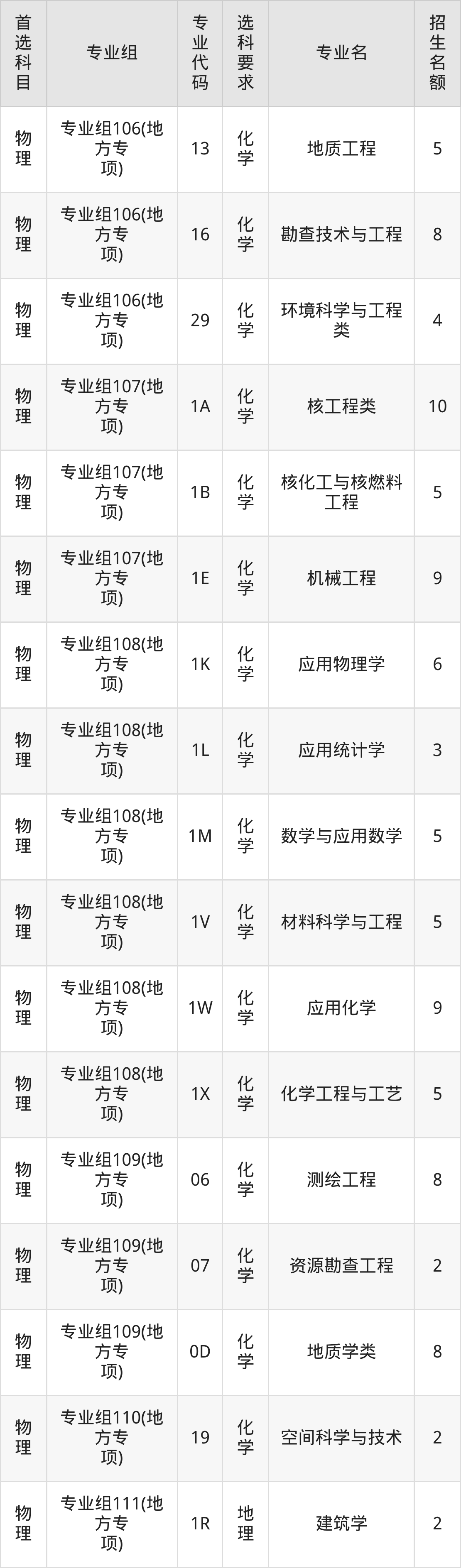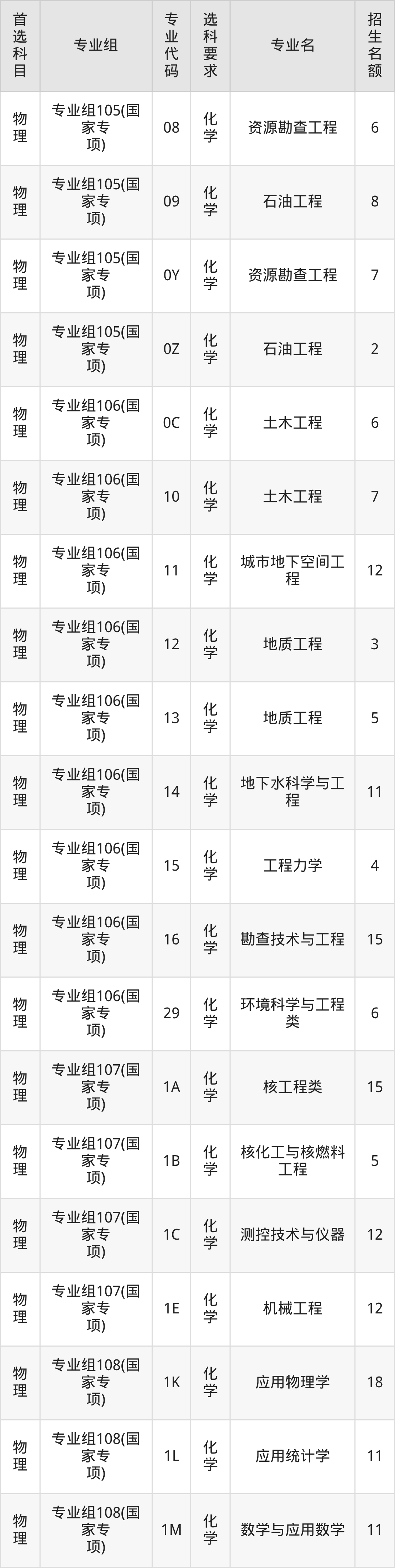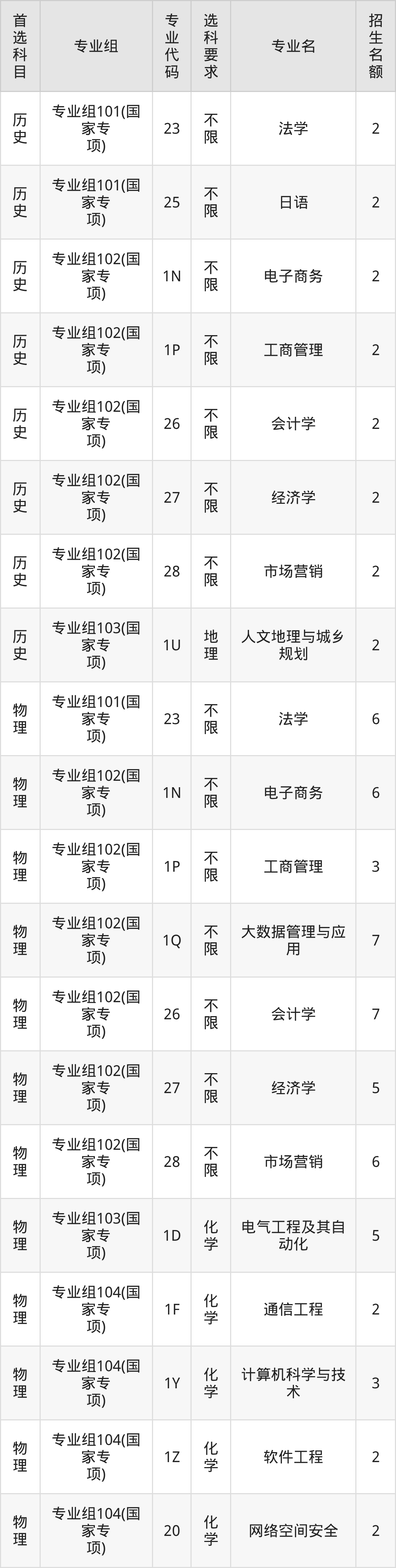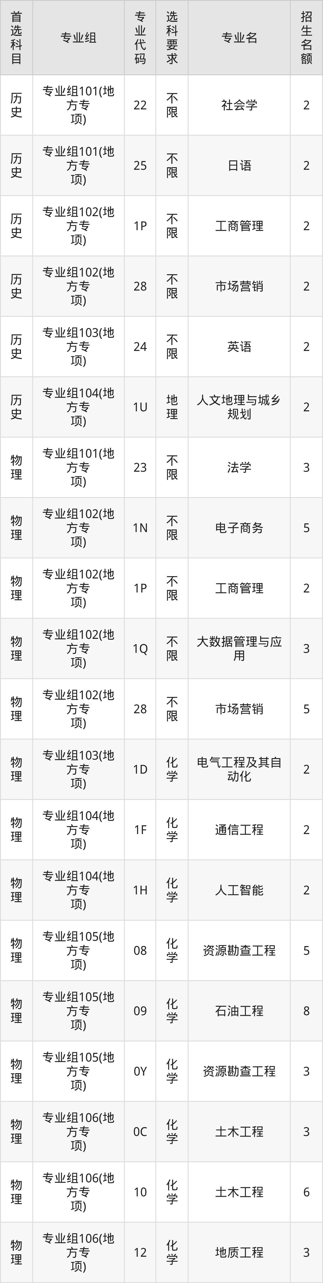 2025年成都理工大学在四川省本科批A段(国家专项)招生中,总计划人数为350人,招生专业有40个,包括法学(8人)、日语(2人)、电子商务(8人)、工商管理(5人)等。