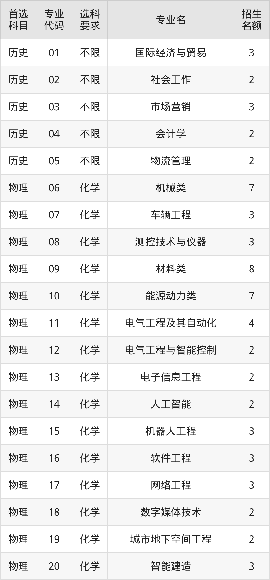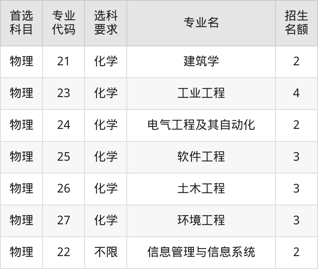 各专业选科要求、招生名额汇总如下: