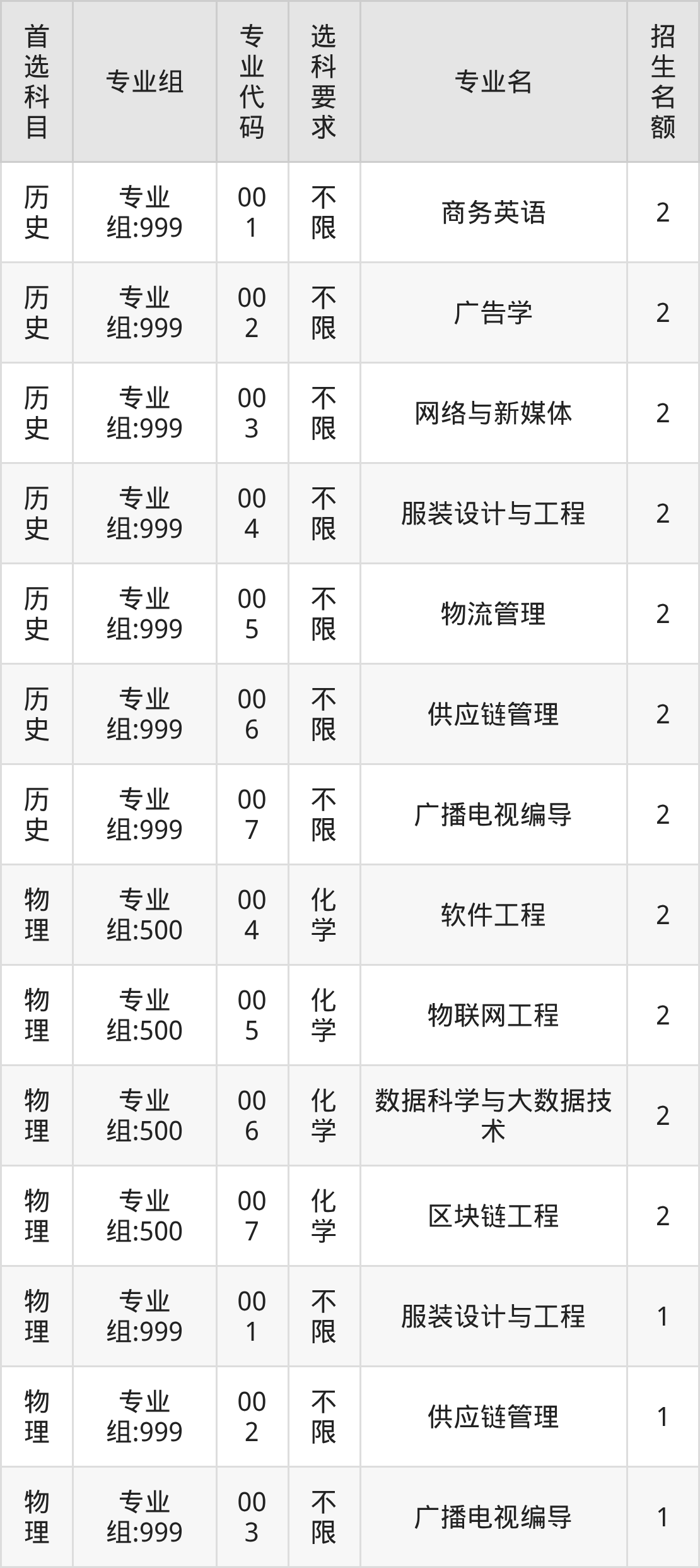 各专业选科要求、招生名额汇总如下: