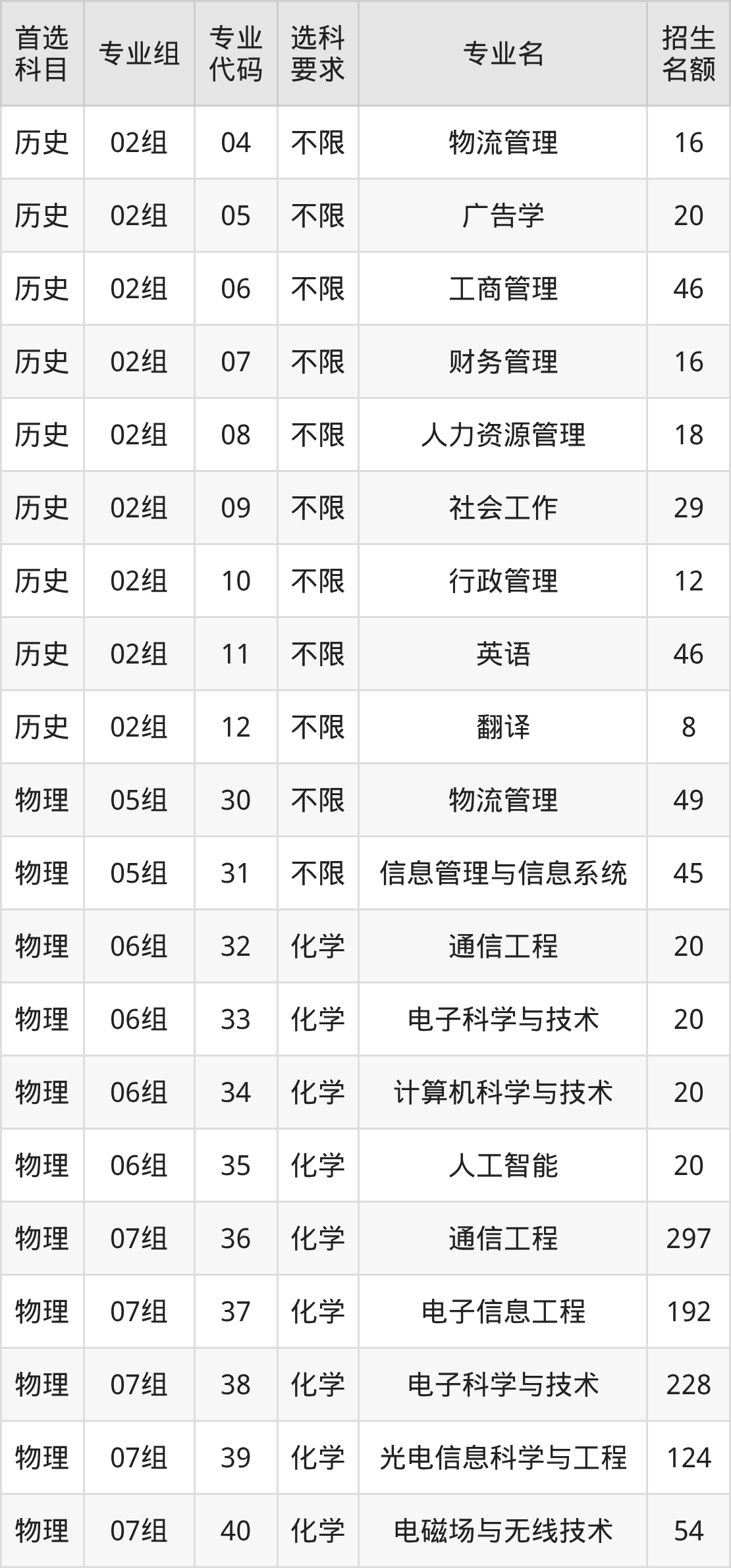 各专业选科要求、招生名额汇总如下: