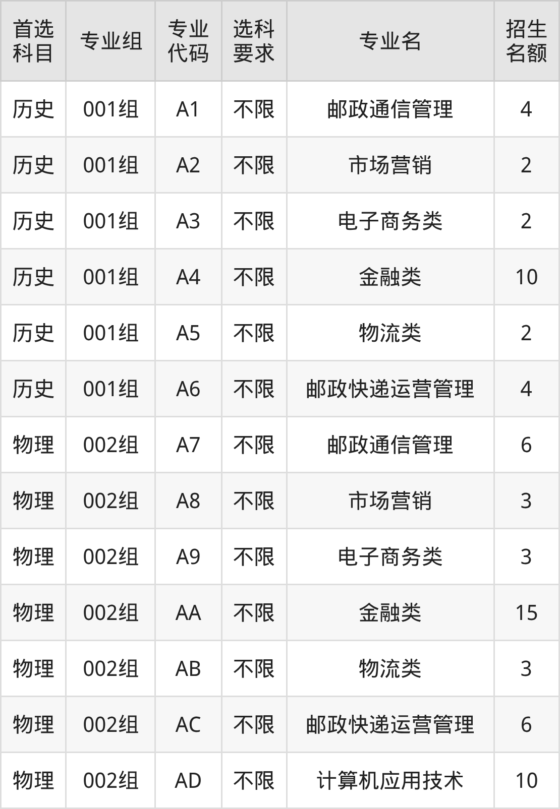 各专业选科要求、招生名额汇总如下: