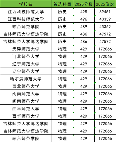 2025年江西历史类师范大学最低录取分数线是486分,收分最低的大学有吉林师范大学博达学院;物理类师范大学最低分是429分,收分最低的大学是吉林师范大学博达学院、琼台师范学院等院校。