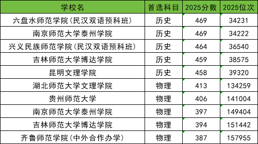 2025年贵州历史类师范大学最低录取分数线是458分,收分最低的大学有昆明文理学院;物理类师范大学最低分是387分,收分最低的大学是齐鲁师范学院(中外合作办学)。