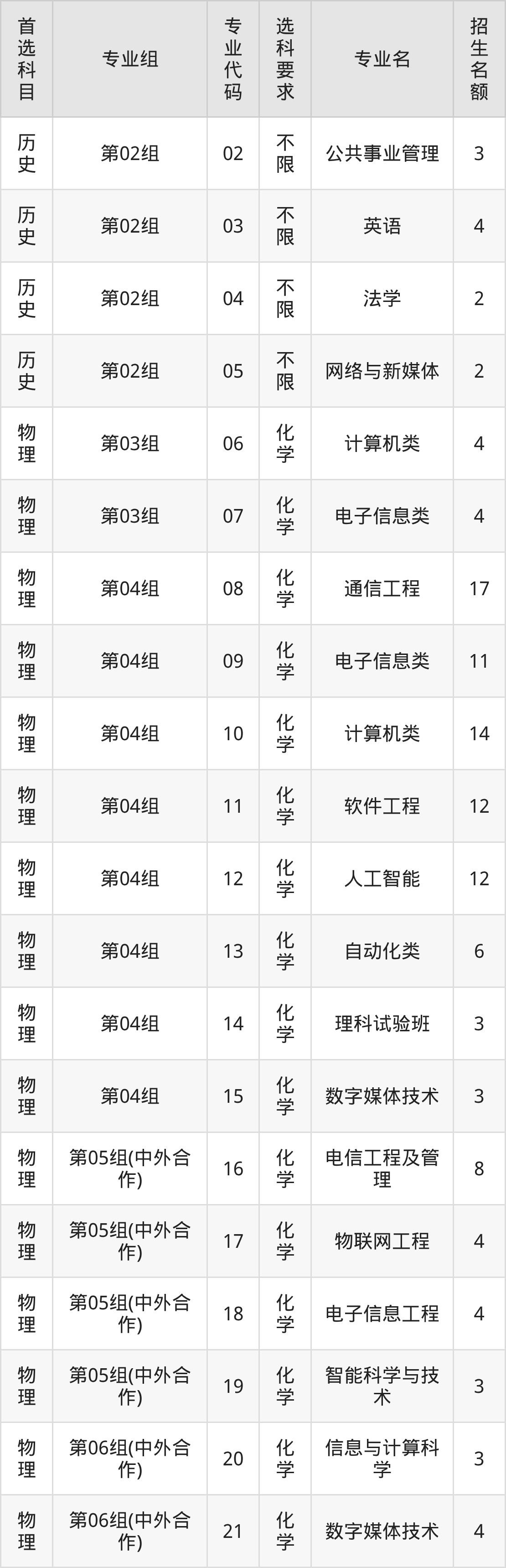 2025年北京邮电大学在湖北省本科批招生中,总计划人数为140人,招生专业有22个,包括公共事业管理(3人)、英语(4人)、法学(2人)、网络与新媒体(2人)等。其中电信工程及管理、物联网工程、电子信息工程为中外合作办学,学费均是100000元/年。