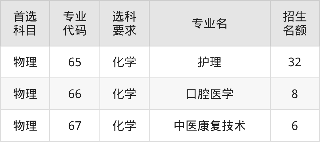 2025年石河子大学在安徽省高职专科批招生中,总计划人数为46人,招生专业有3个,包括护理(32人)、口腔医学(8人)、中医康复技术(6人)等。
