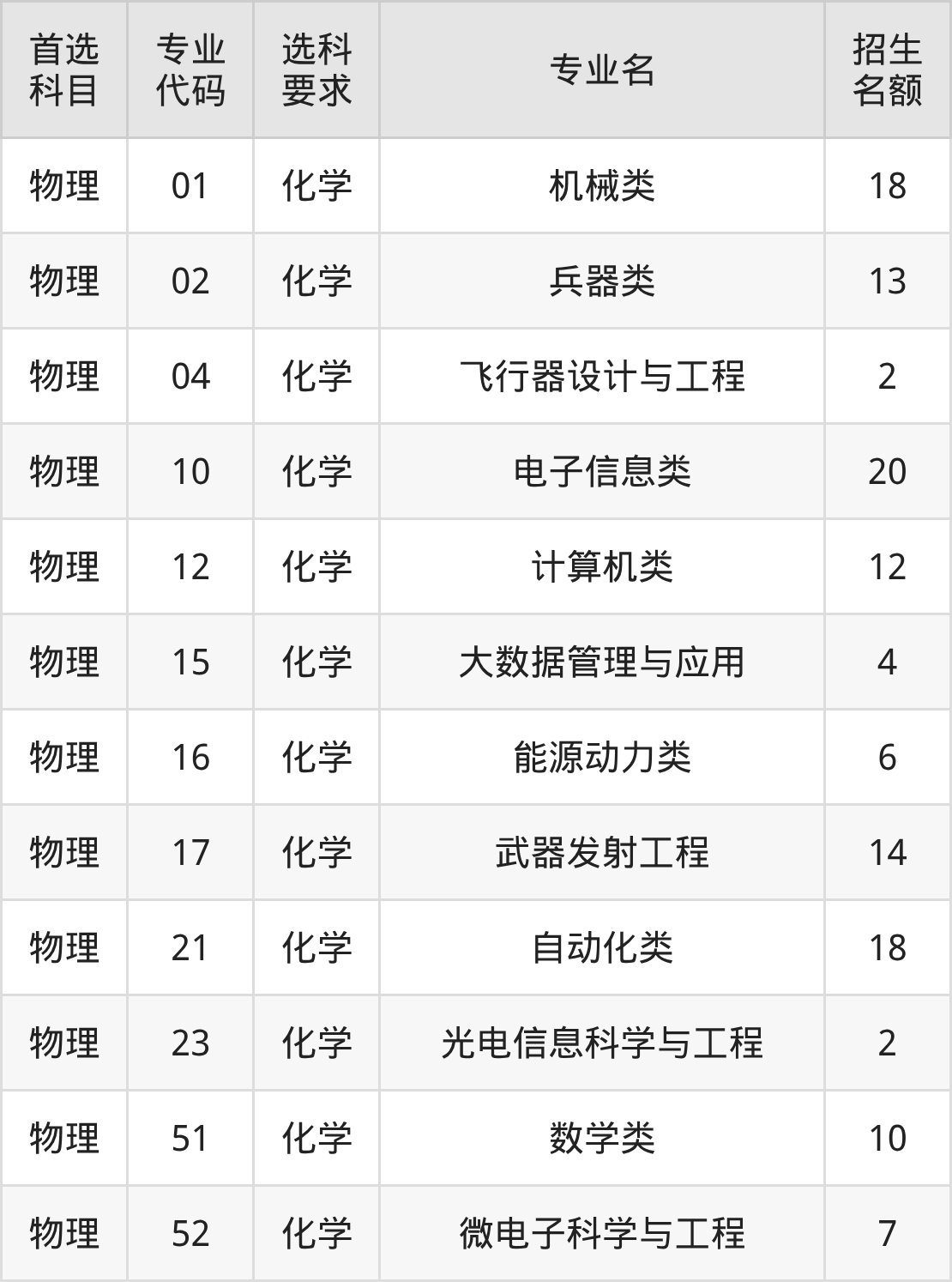 2025年南京理工大学在辽宁省本科批招生中,总计划人数为126人,招生专业有12个,包括机械类(18人)、兵器类(13人)、飞行器设计与工程(2人)、电子信息类(20人)等。