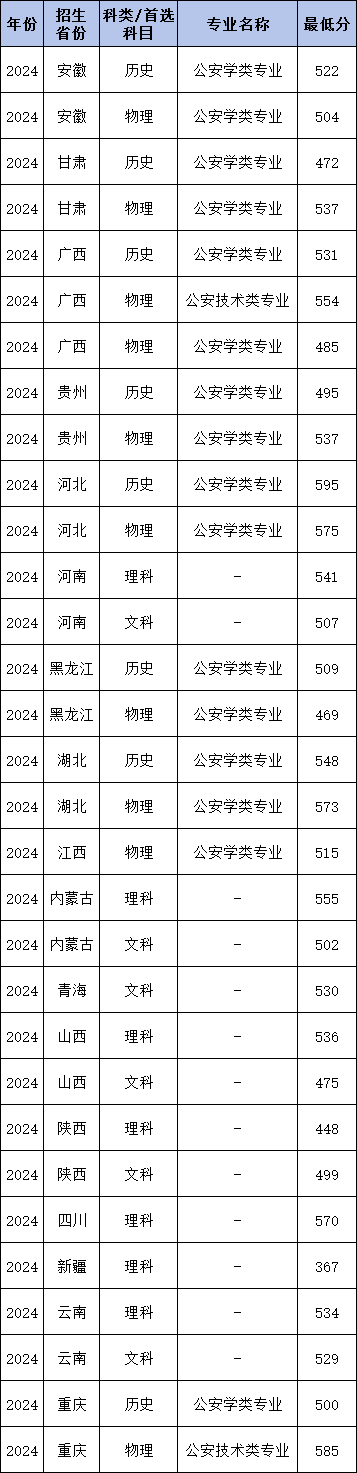 2024年南京警察学院国家专项计划在贵州录取最低分历史类为495分、物理类为537分,历史组收分最低的专业为公安学类专业、物理组收分最低的专业为公安学类专业。