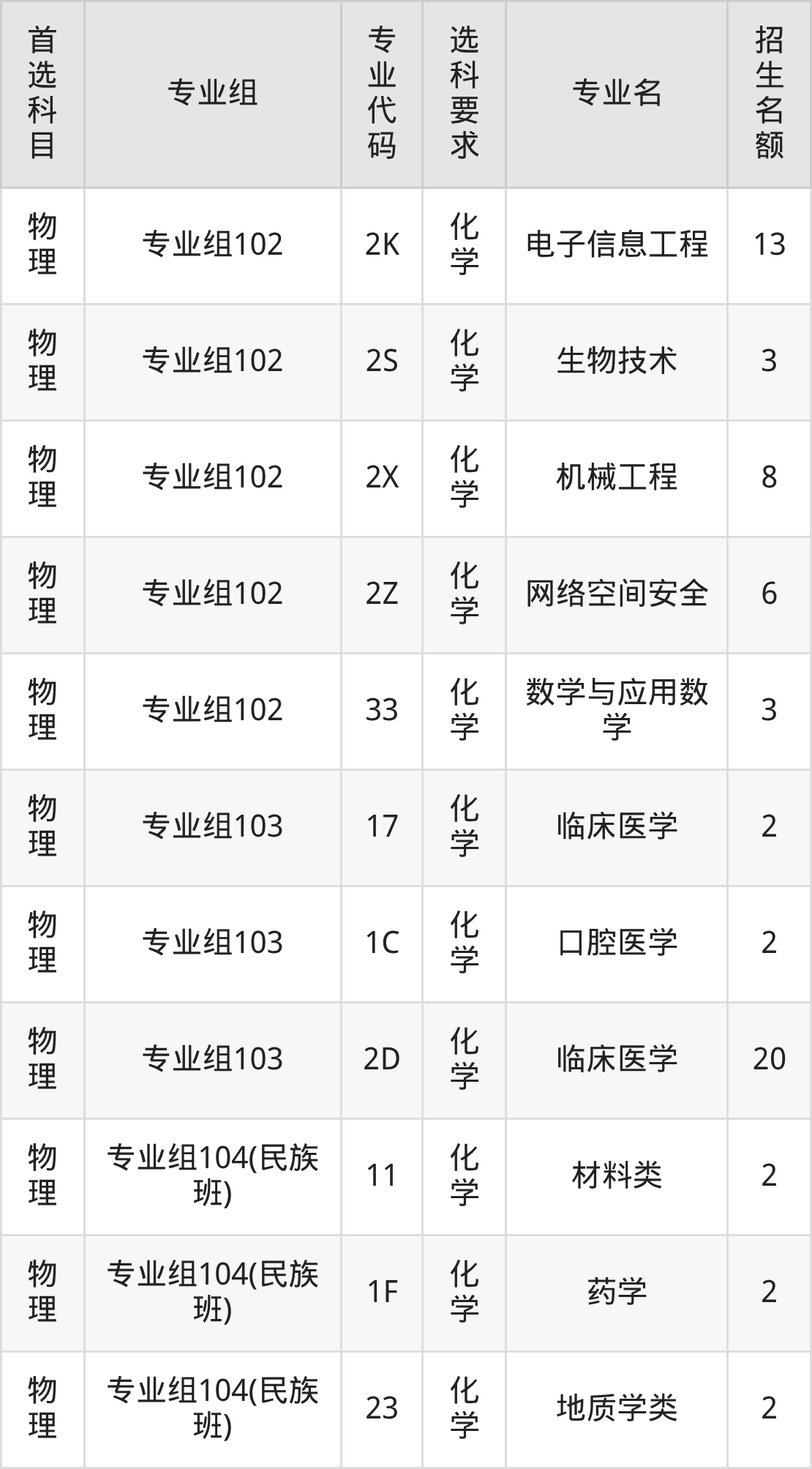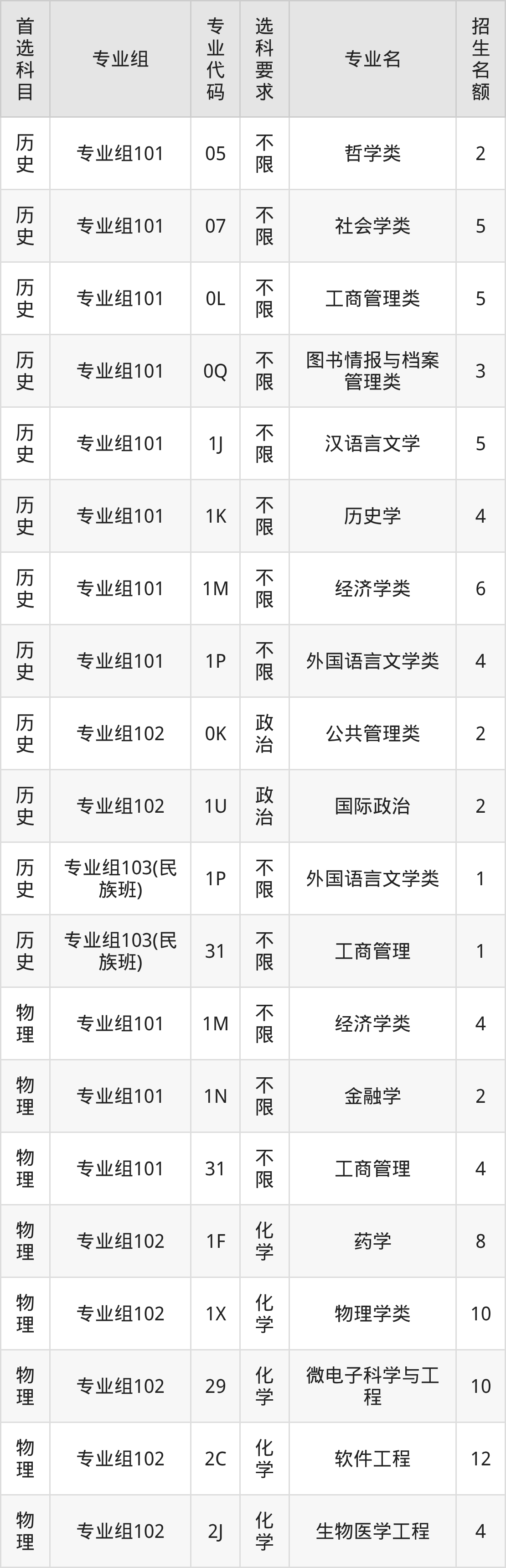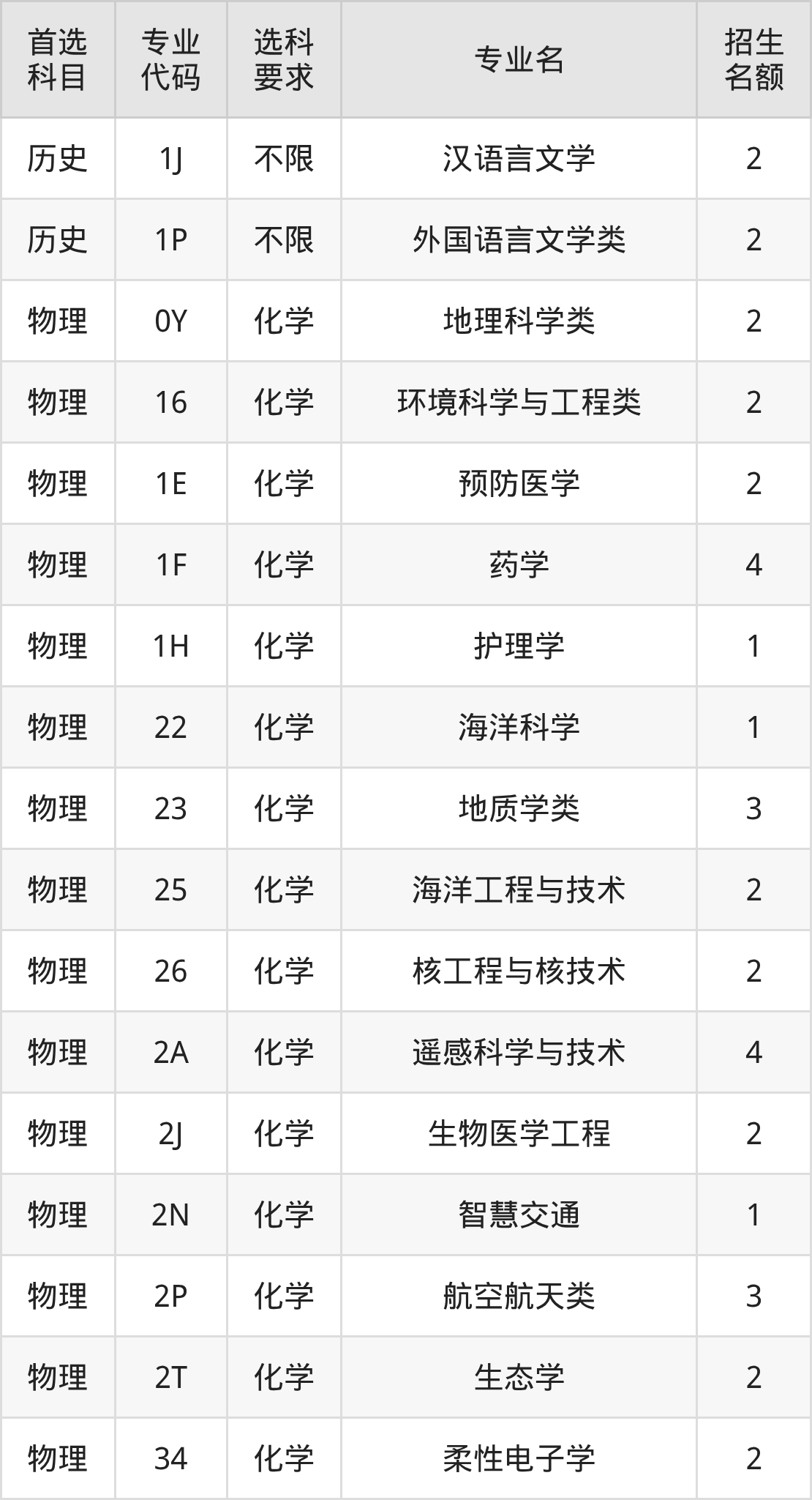 各专业选科要求、招生名额汇总如下: