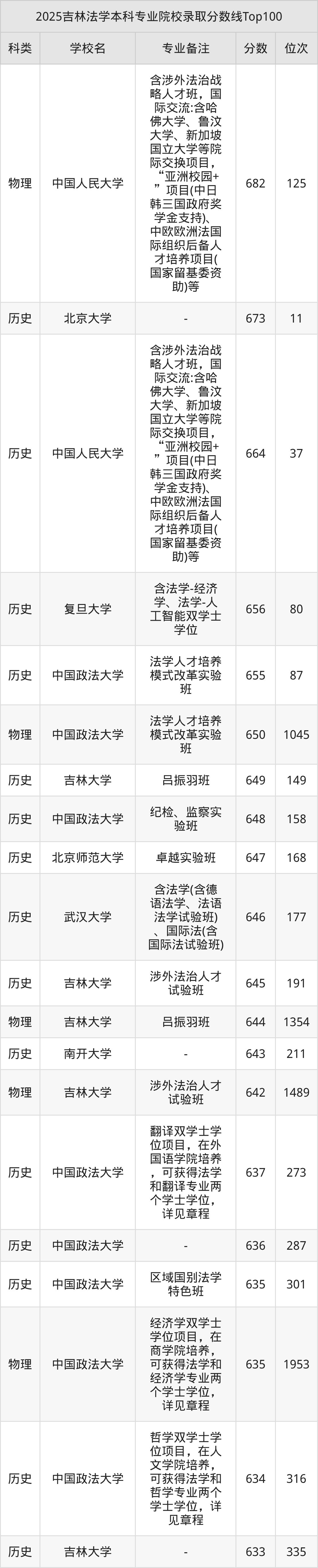 2025年吉林法学本科专业招生院校有192所,分数最低的是广州新华学院(351分、物理类位次67278名),分数最高的是中国人民大学(682分、物理类位次125名)。
