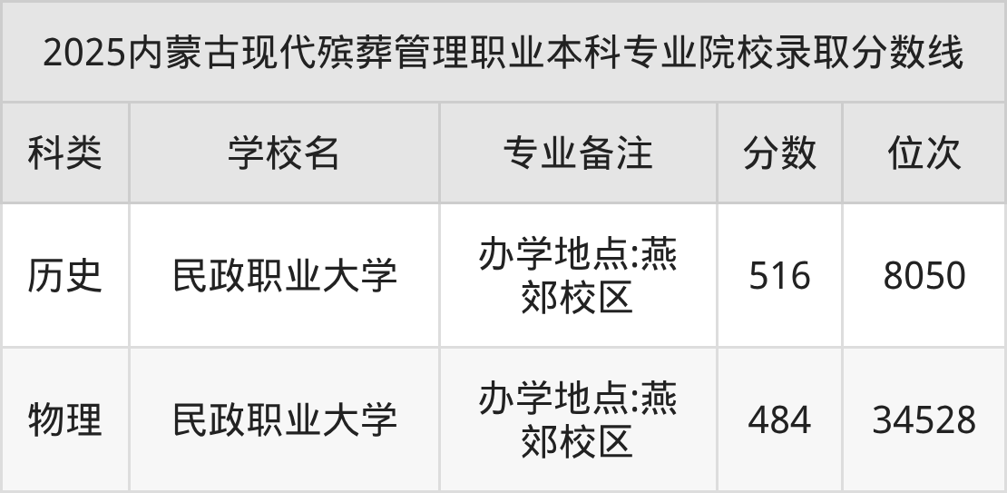 2025年内蒙古现代殡葬管理分数线排名前2的大学名单(本科最难报考):