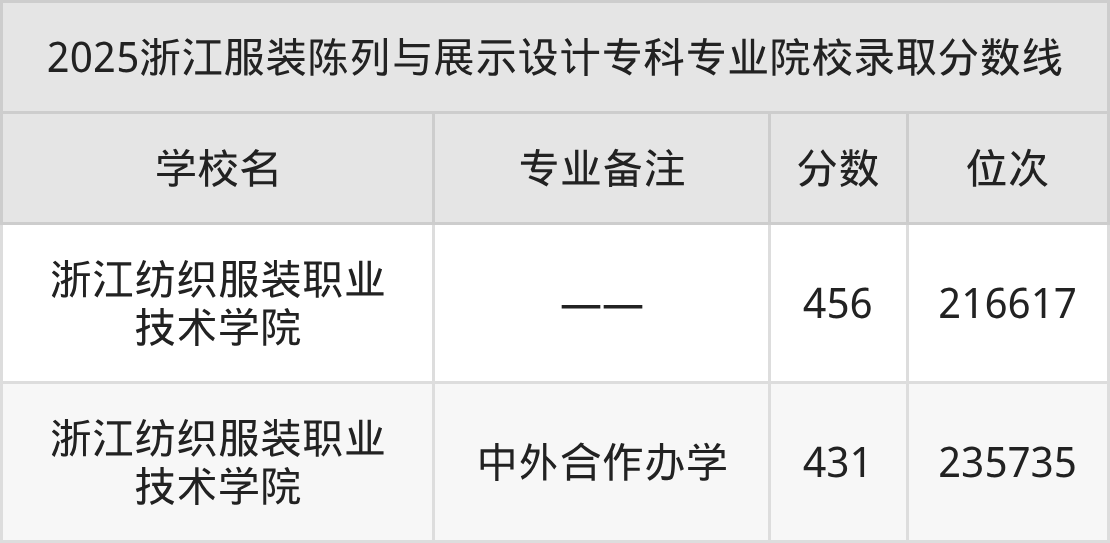 2025年浙江服装陈列与展示设计专科专业招生院校只有1所,即浙江纺织服装职业技术学院,2025年该校服装陈列与展示设计专业在浙江省的最低录取分数线为431分,最低录取位次在235735名及以内。