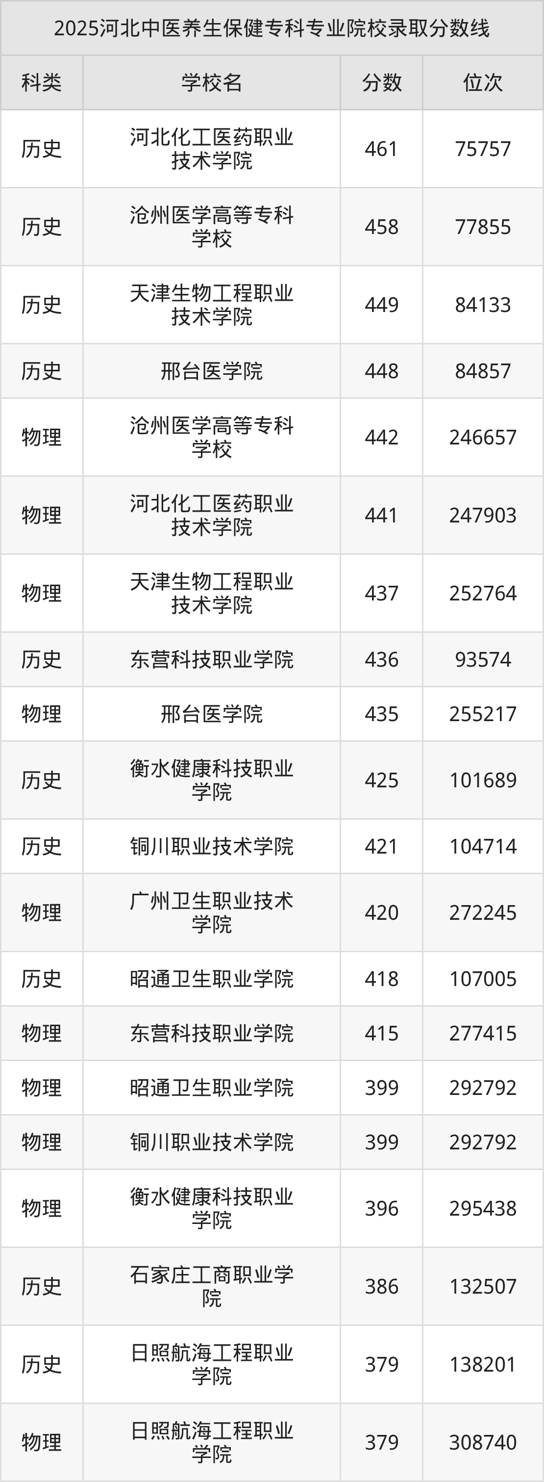 1、河北化工医药职业技术学院:中医养生保健461分、历史类位次75757名;