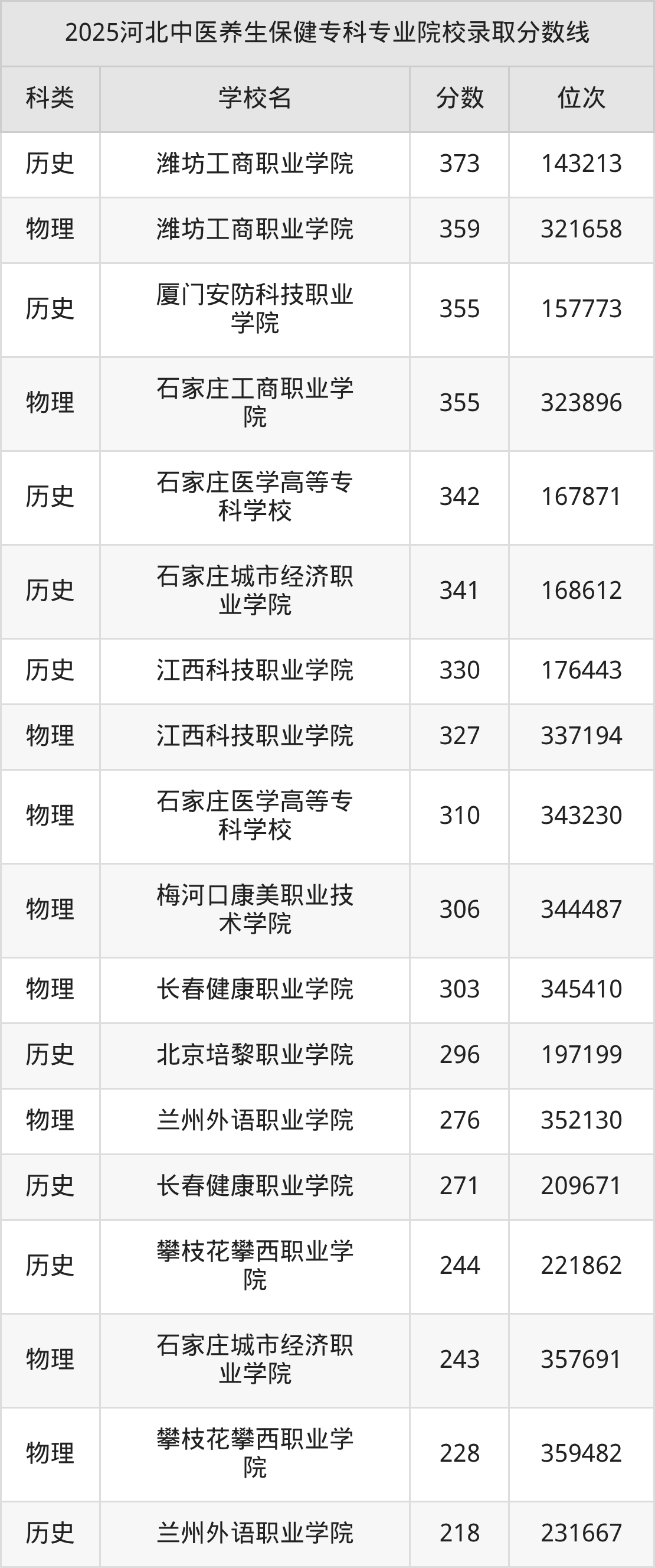 2025中医养生保健专业在河北省录取分数线为:专科218分-461分。结合批次线来看,考生成绩超专科线18分及以上即有机会就读中医养生保健专科专业,低分录取的专科院校有兰州外语职业学院。2026届考生可在下文查阅更多院校名单、分数及排名信息。