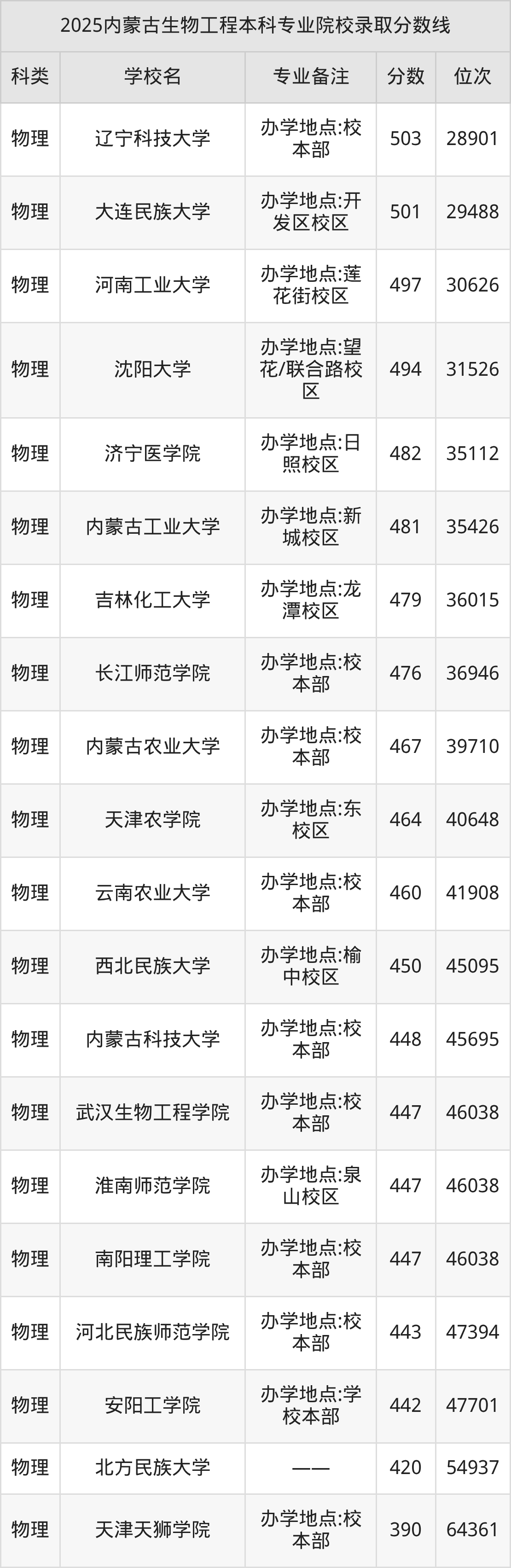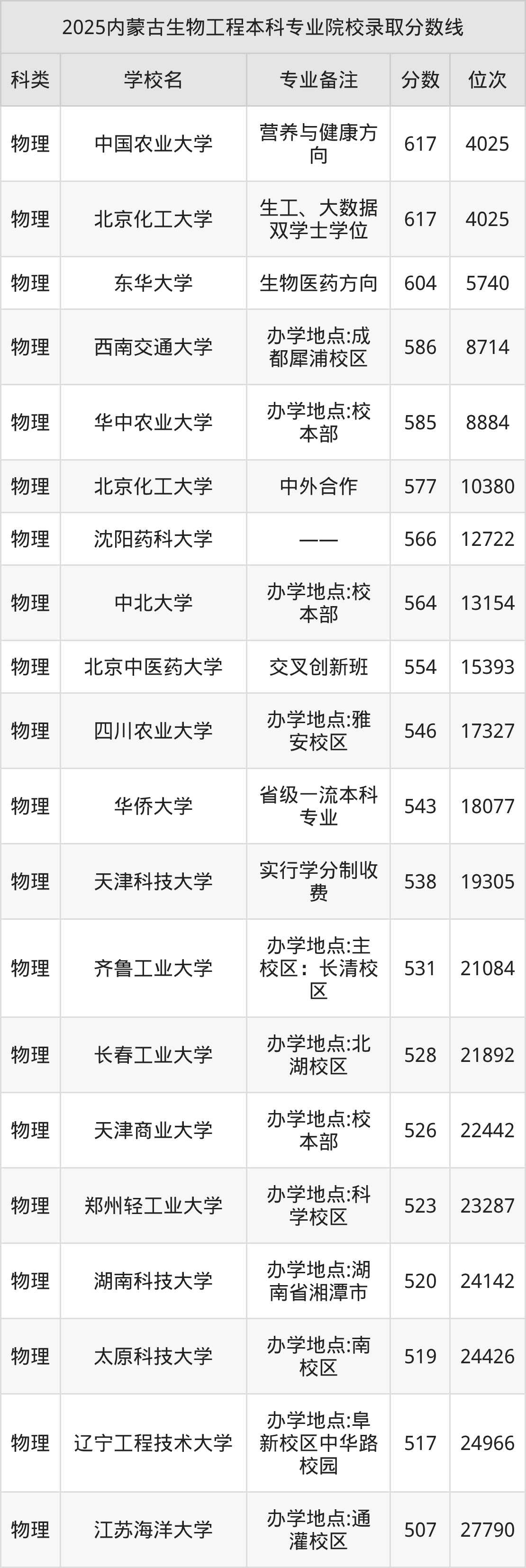 2025年内蒙古生物工程分数线排名前5的大学名单(本科最难报考):