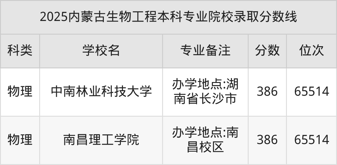 从院校办学性质来看,本科生物工程公办院校最低分在386分及以上,低分对应院校为中南林业科技大学,2025年超本科线11分录取。民办院校最低分在386分及以上,低分对应院校为南昌理工学院,2025年超本科线11分录取。