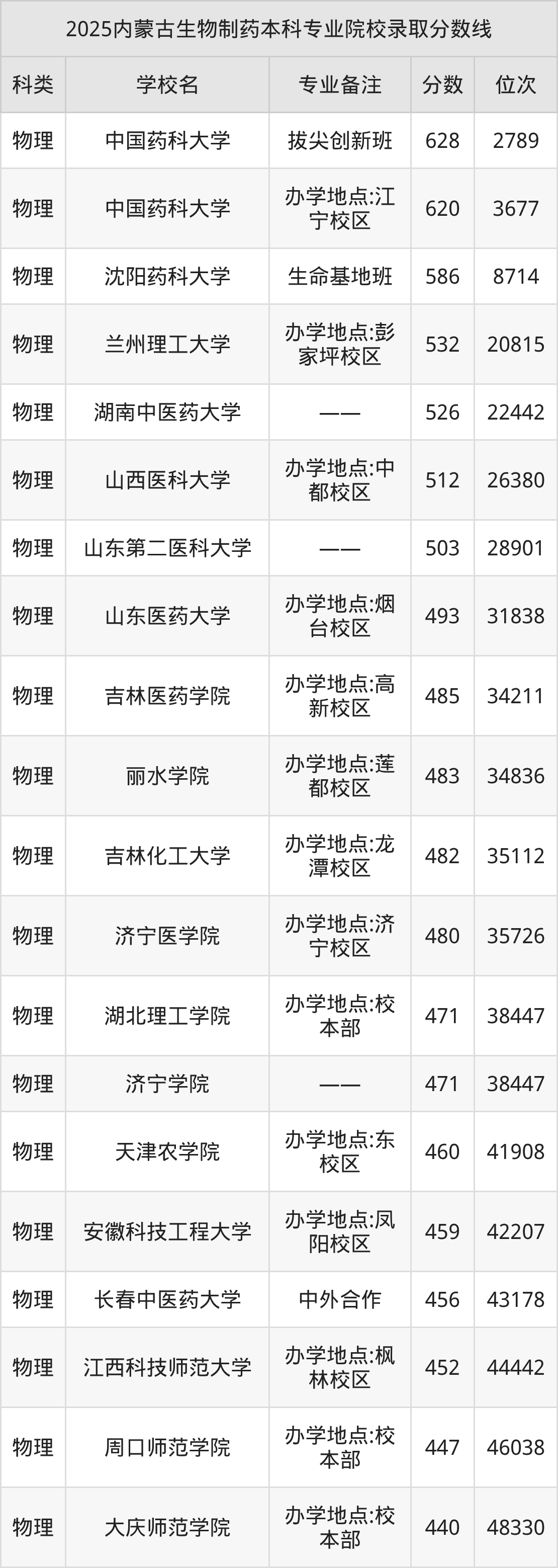 1、中国药科大学:生物制药(拔尖创新班)628分、物理类位次2789名;