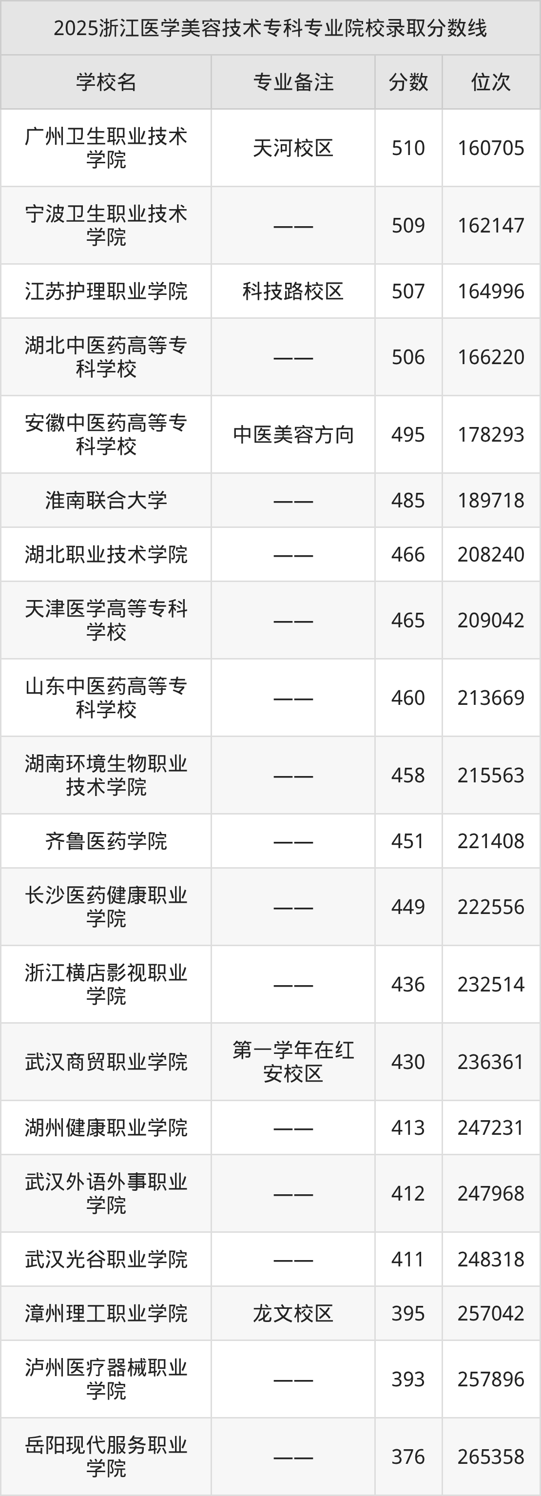 1、广州卫生职业技术学院:医学美容技术(天河校区)510分、位次160705名;