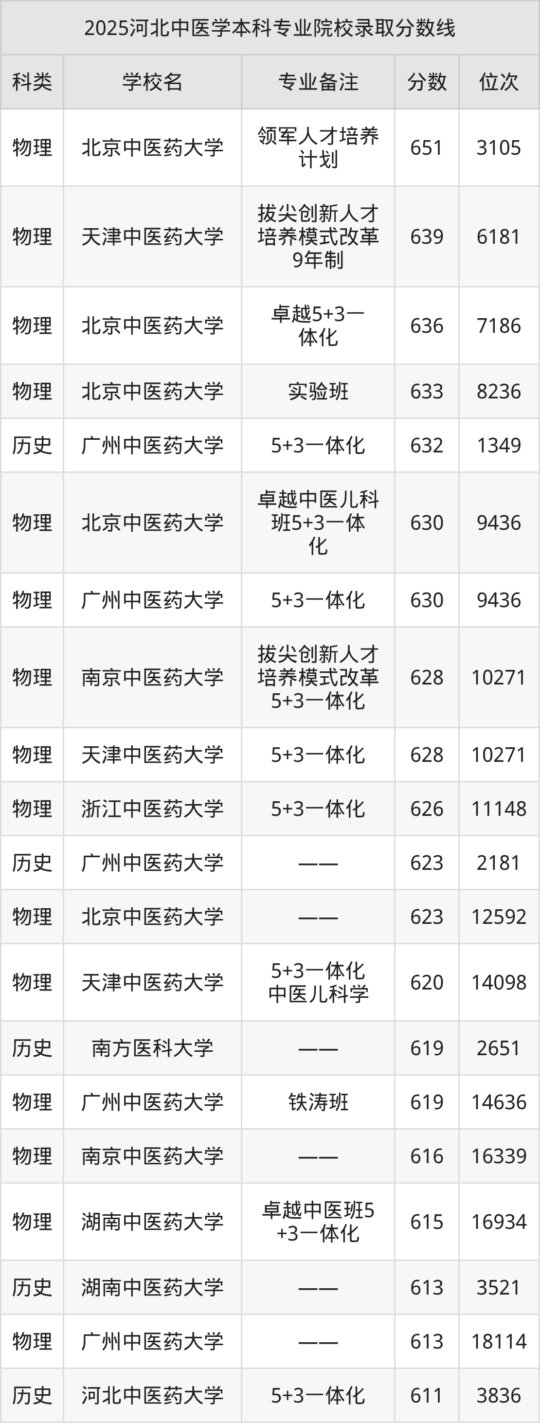 1、北京中医药大学:中医学(领军人才培养计划)651分、物理类位次3105名;