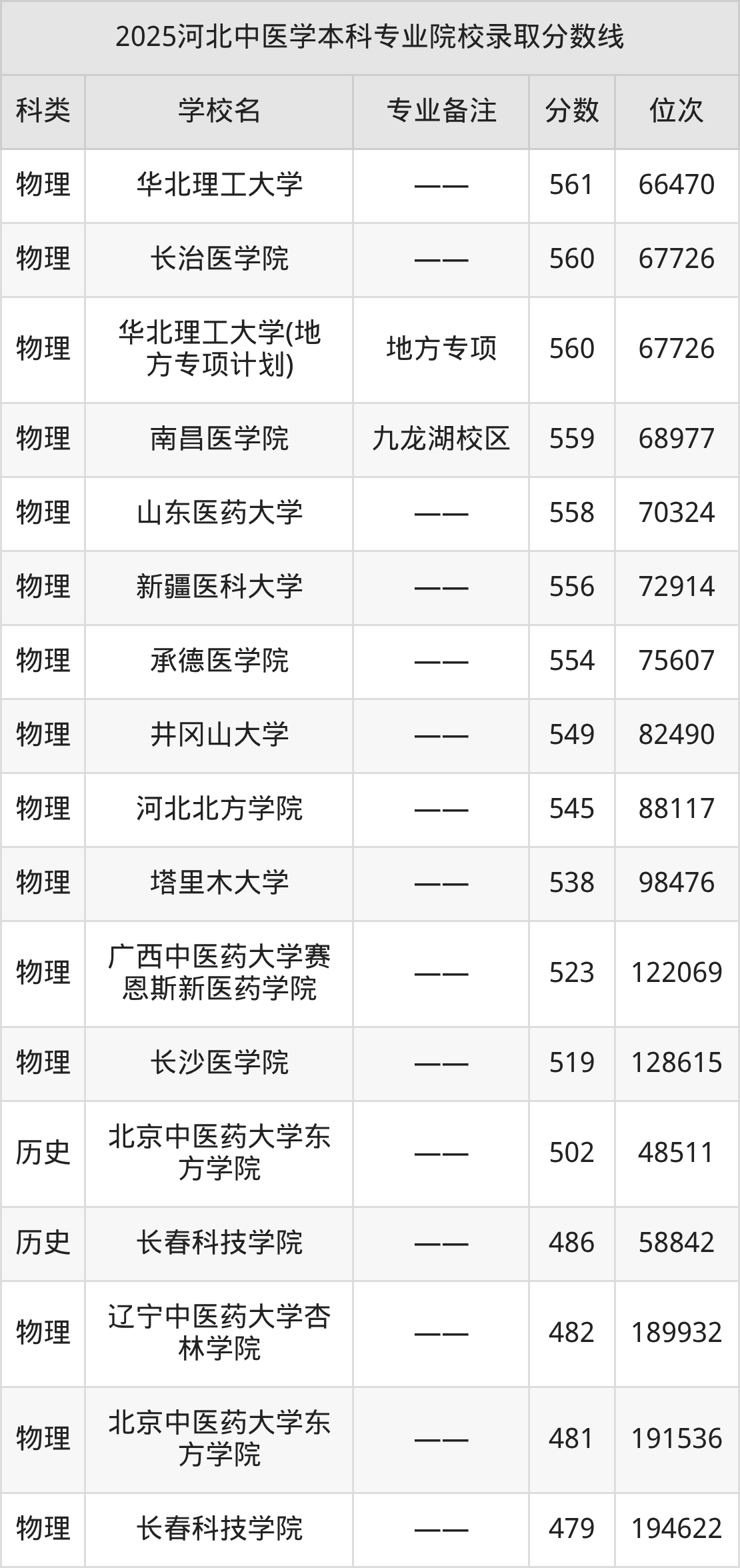 从院校办学性质来看,本科中医学公办院校最低分在538分及以上,低分对应院校为塔里木大学,2025年超本科线79分录取。民办院校最低分在479分及以上,低分对应院校为长春科技学院,2025年超本科线20分录取。