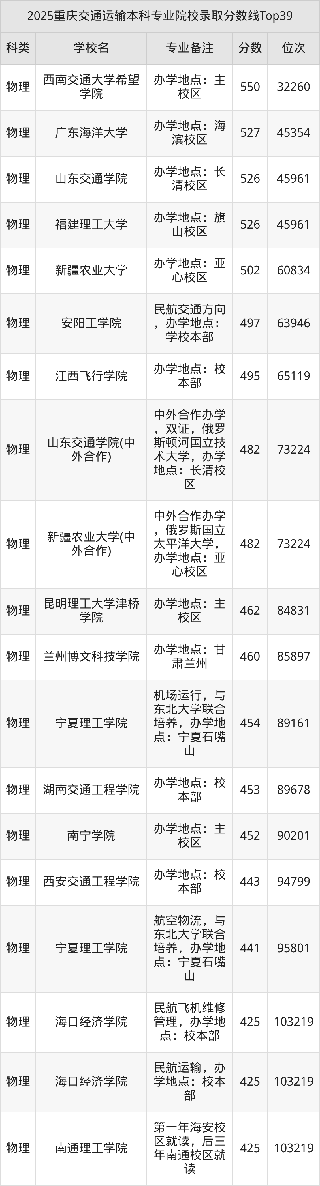 2025年重庆交通运输本科专业招生院校有33所,分数最低的是海口经济学院(425分、物理类位次103219名)、海口经济学院(425分、物理类位次103219名)、南通理工学院(425分、物理类位次103219名)等,分数最高的是北京交通大学(中外合作)(606分、物理类位次10026名)。