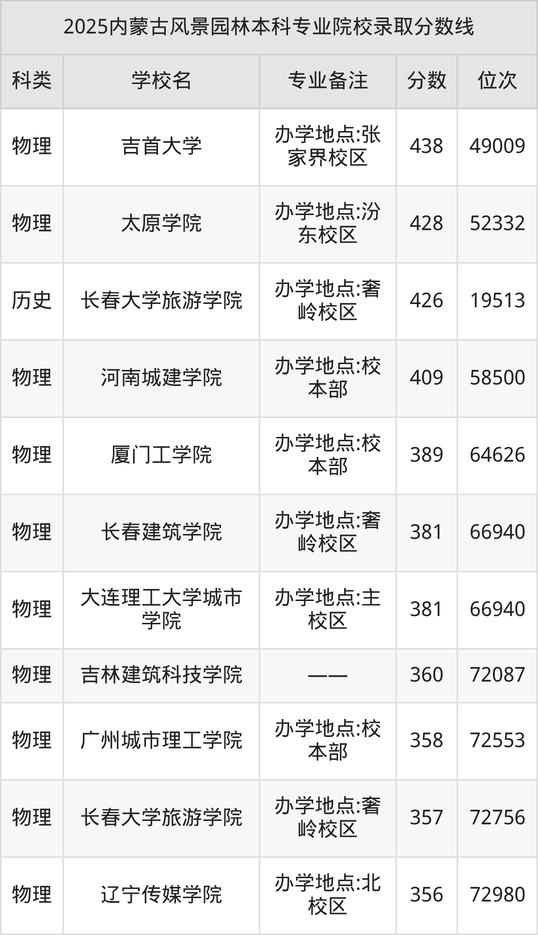 2025风景园林专业在内蒙古录取分数线为:本科356分-586分。结合批次线来看,低于本科线19分也有机会就读风景园林本科专业,低分录取的本科院校有辽宁传媒学院。2026届考生可在下文查阅更多院校名单、分数及排名信息。