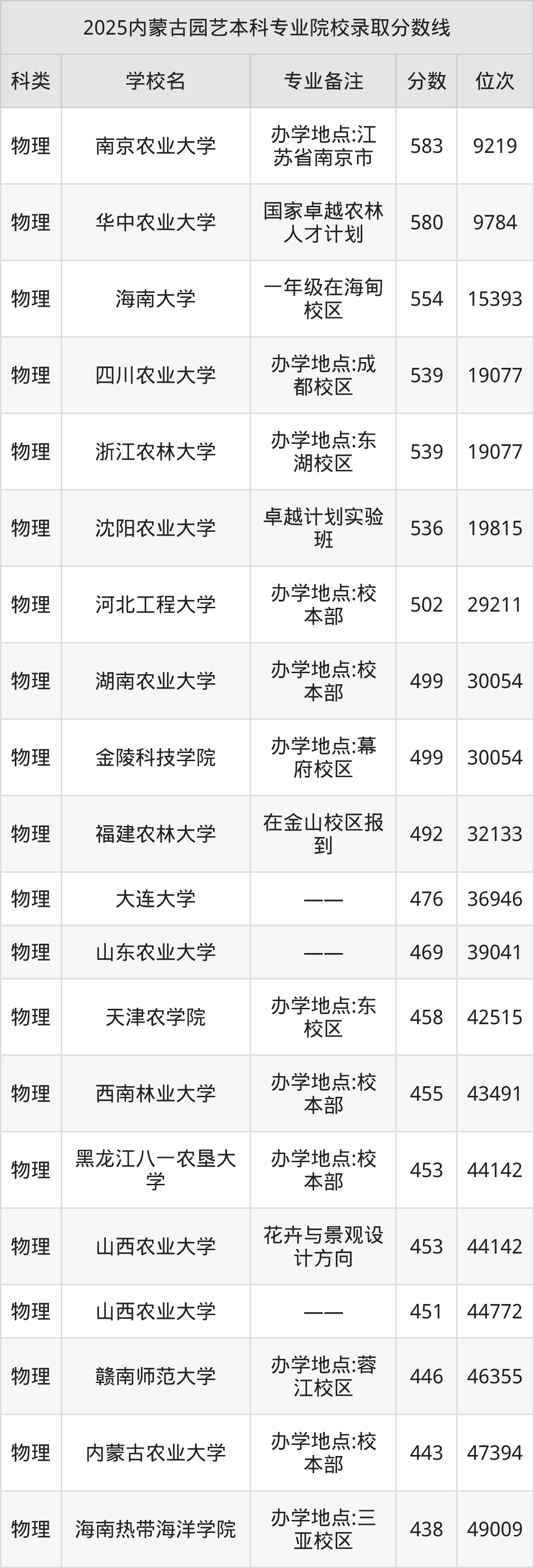 2025年内蒙古园艺分数线排名前5的大学名单(本科最难报考):