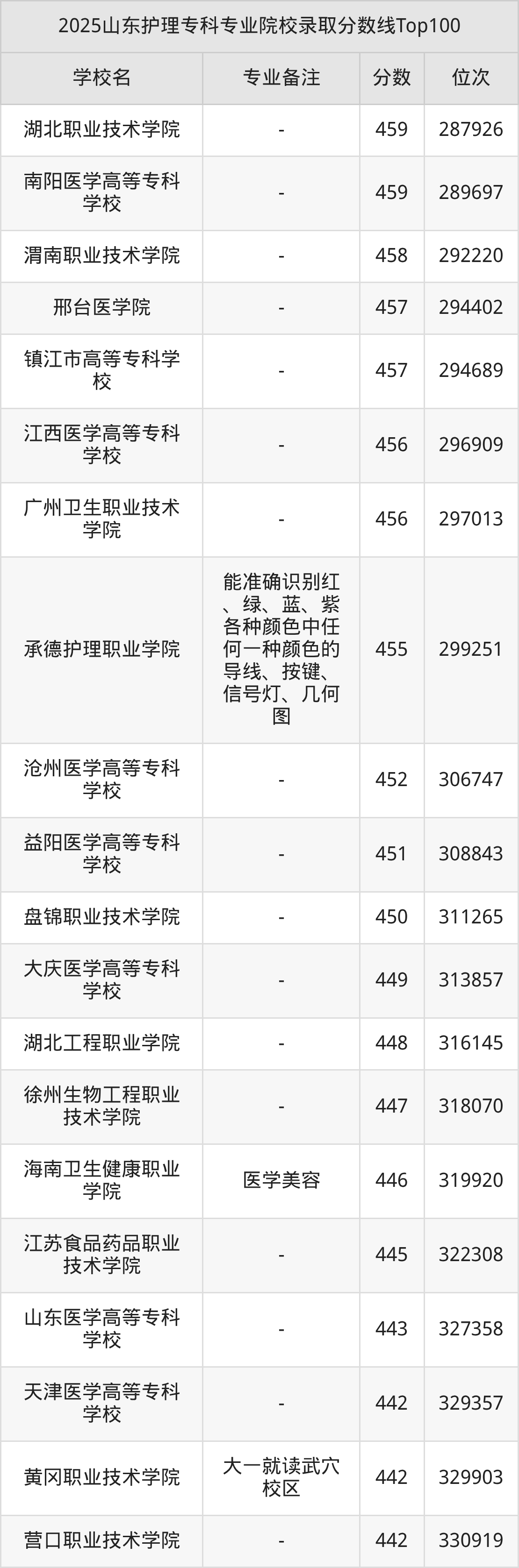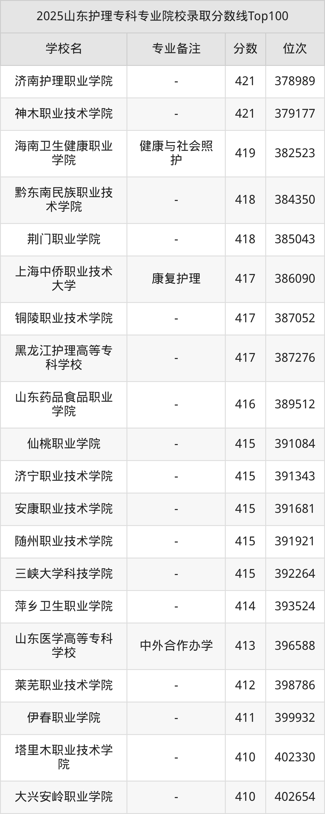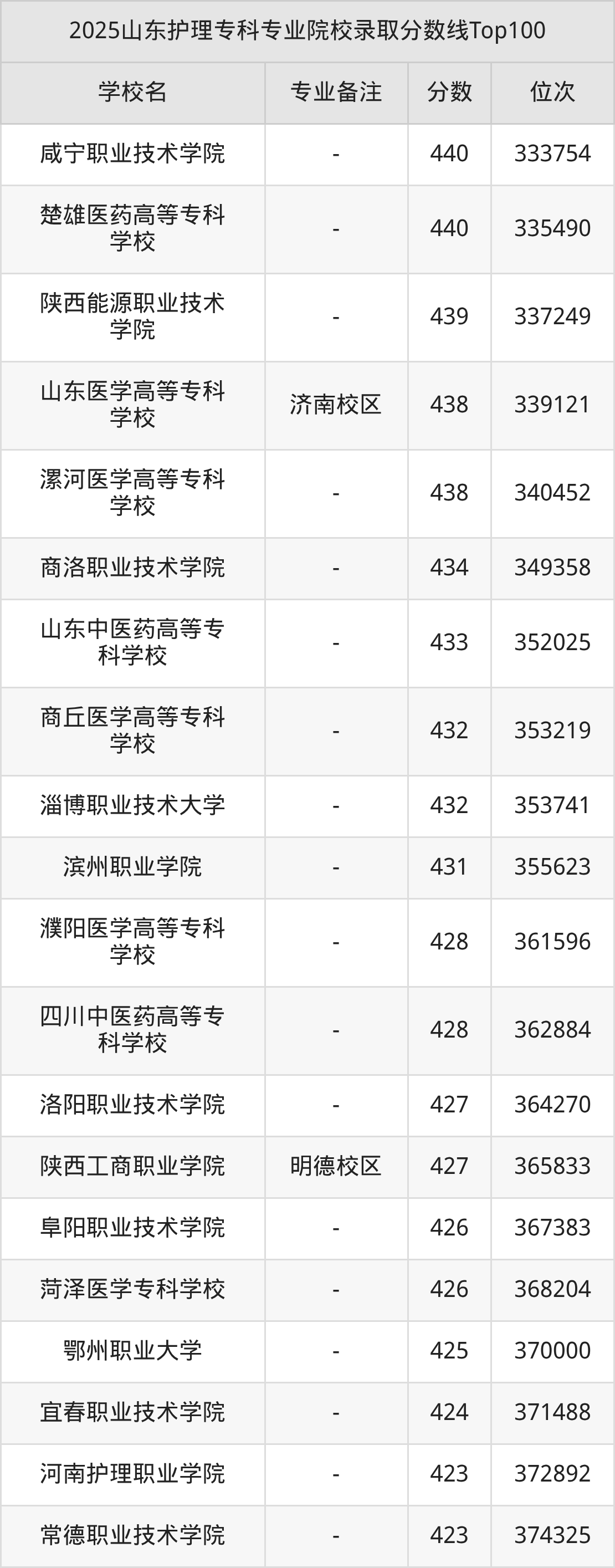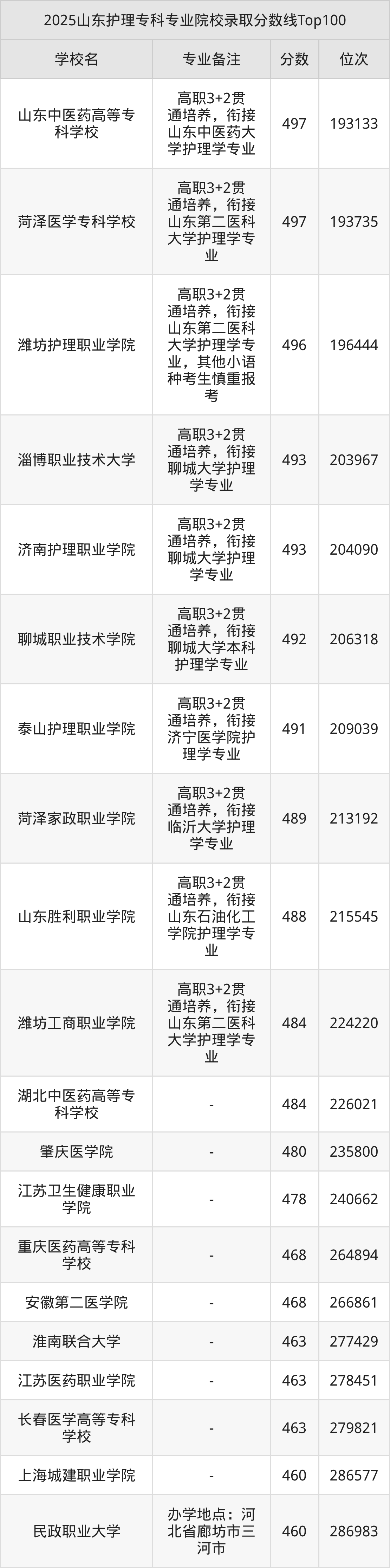 2025年山东护理专科专业招生院校有231所,分数最低的是昆明卫生职业学院(156分、位次680545名),分数最高的是山东中医药高等专科学校(497分、位次193133名)、菏泽医学专科学校(497分、位次193735名)。