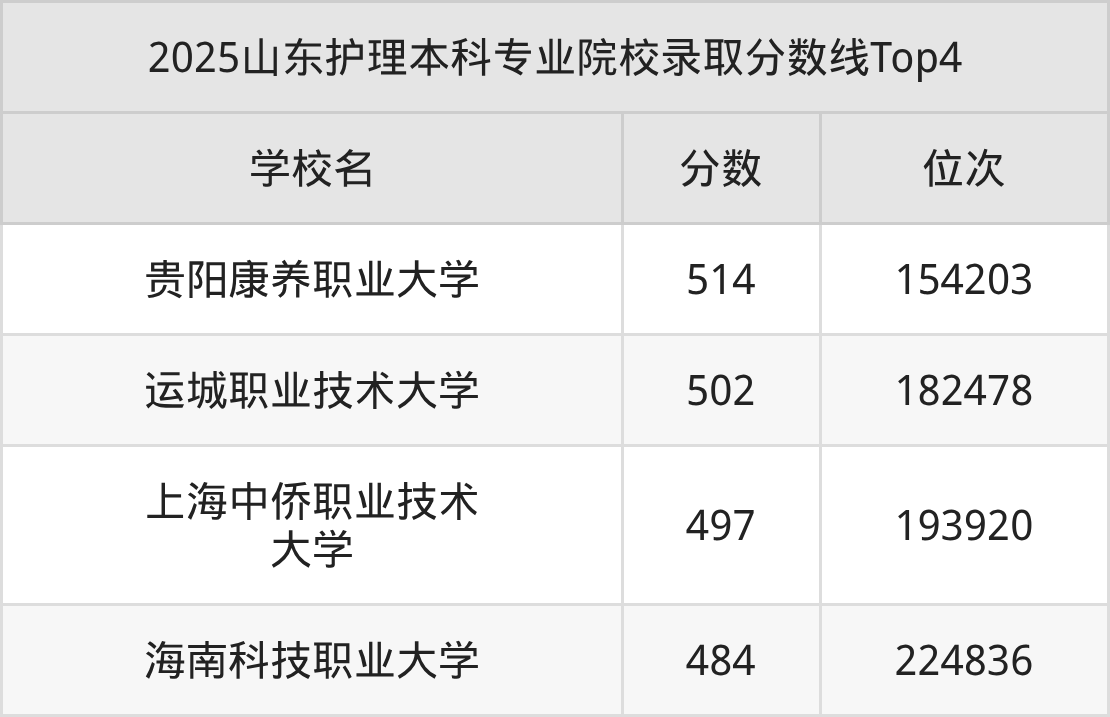 2025年山东护理本科专业招生院校有4所,分数最低的是海南科技职业大学(484分、位次224836名),分数最高的是贵阳康养职业大学(514分、位次154203名)。